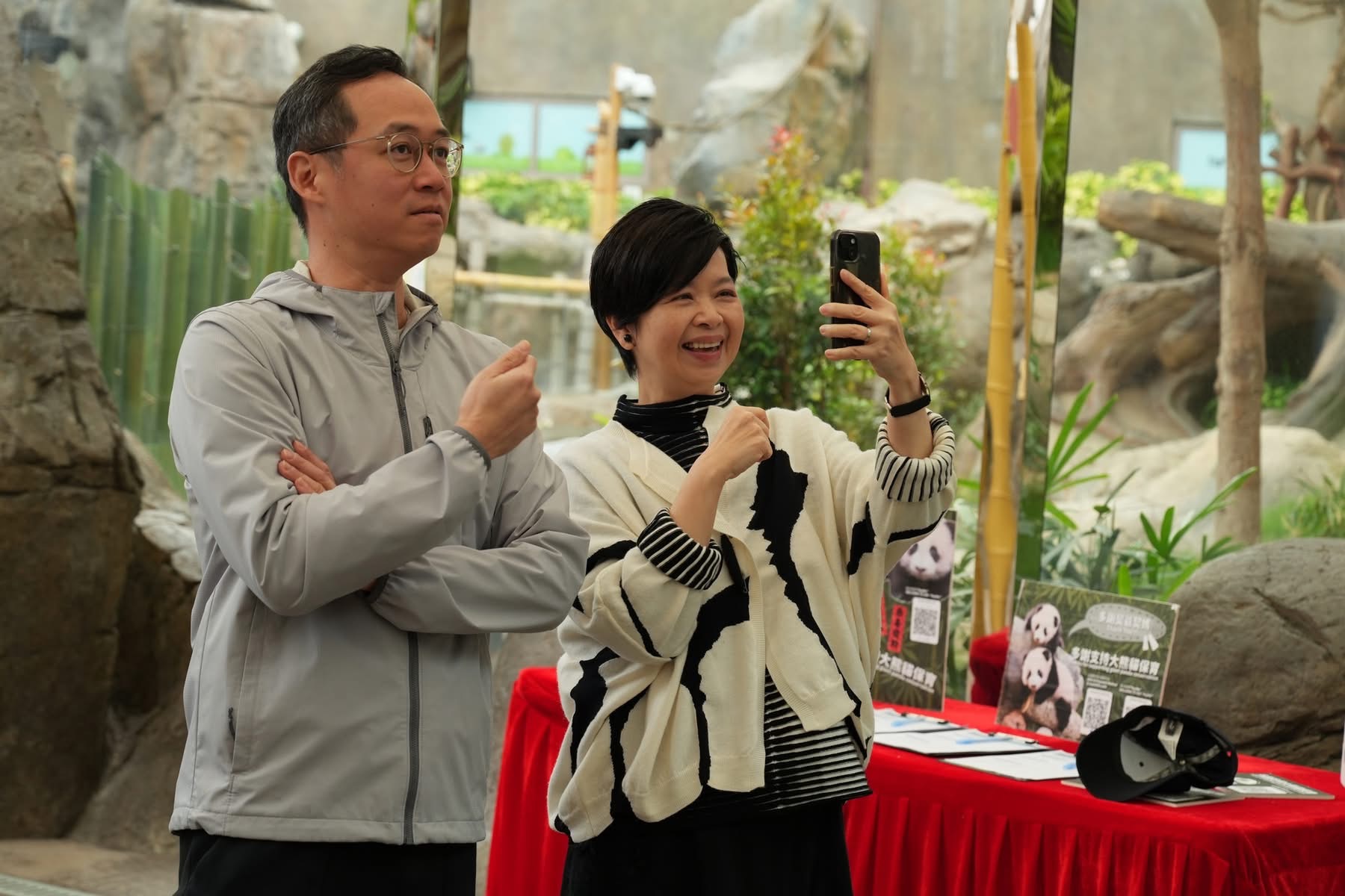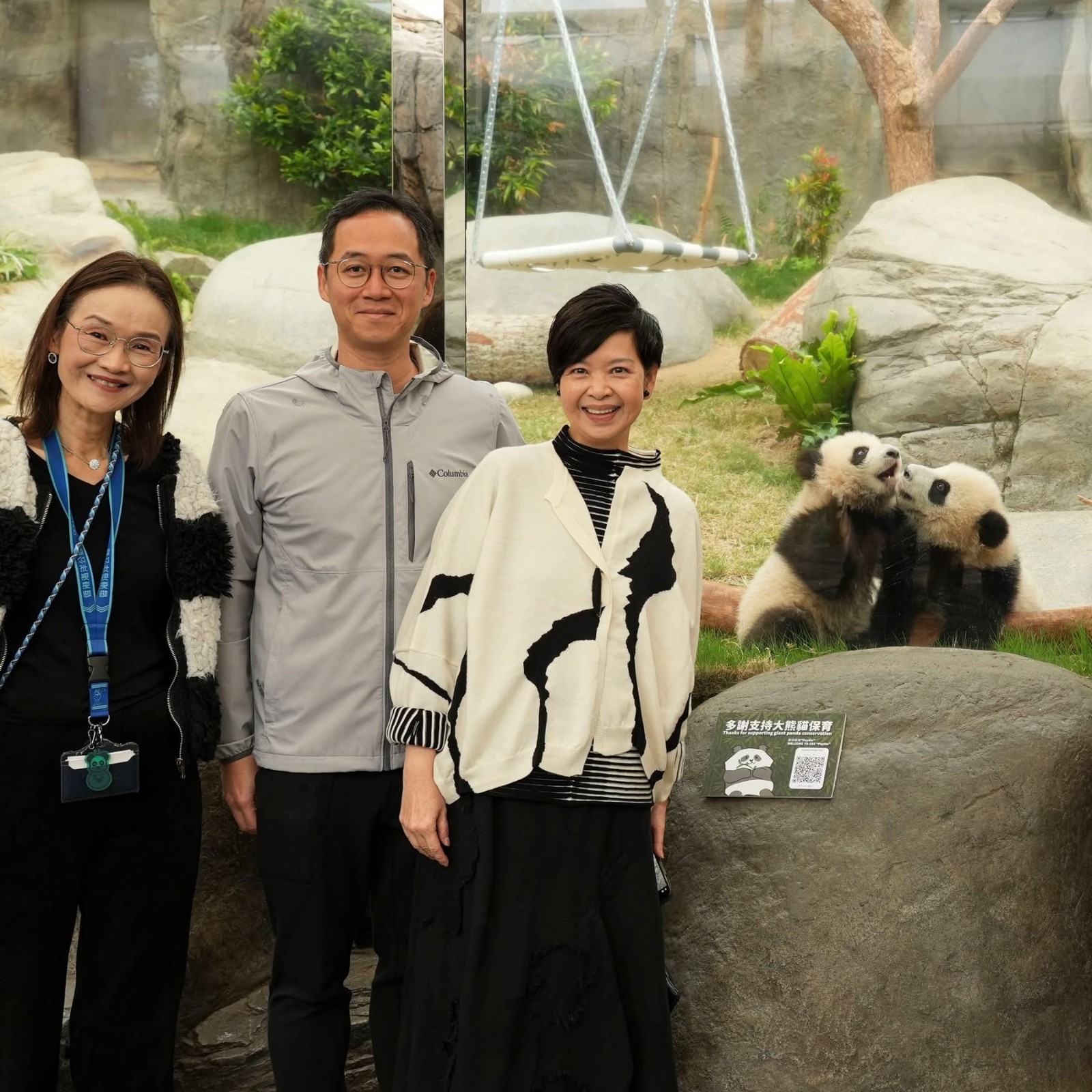 港產大熊貓龍鳳胎成為香港的寵兒,城中掀起一股熊貓熱,連政商名人都爭先恐後地跑海洋公園去「擼熊貓」。房屋局局長何永賢就化身小粉絲,和熊貓BB合照。
