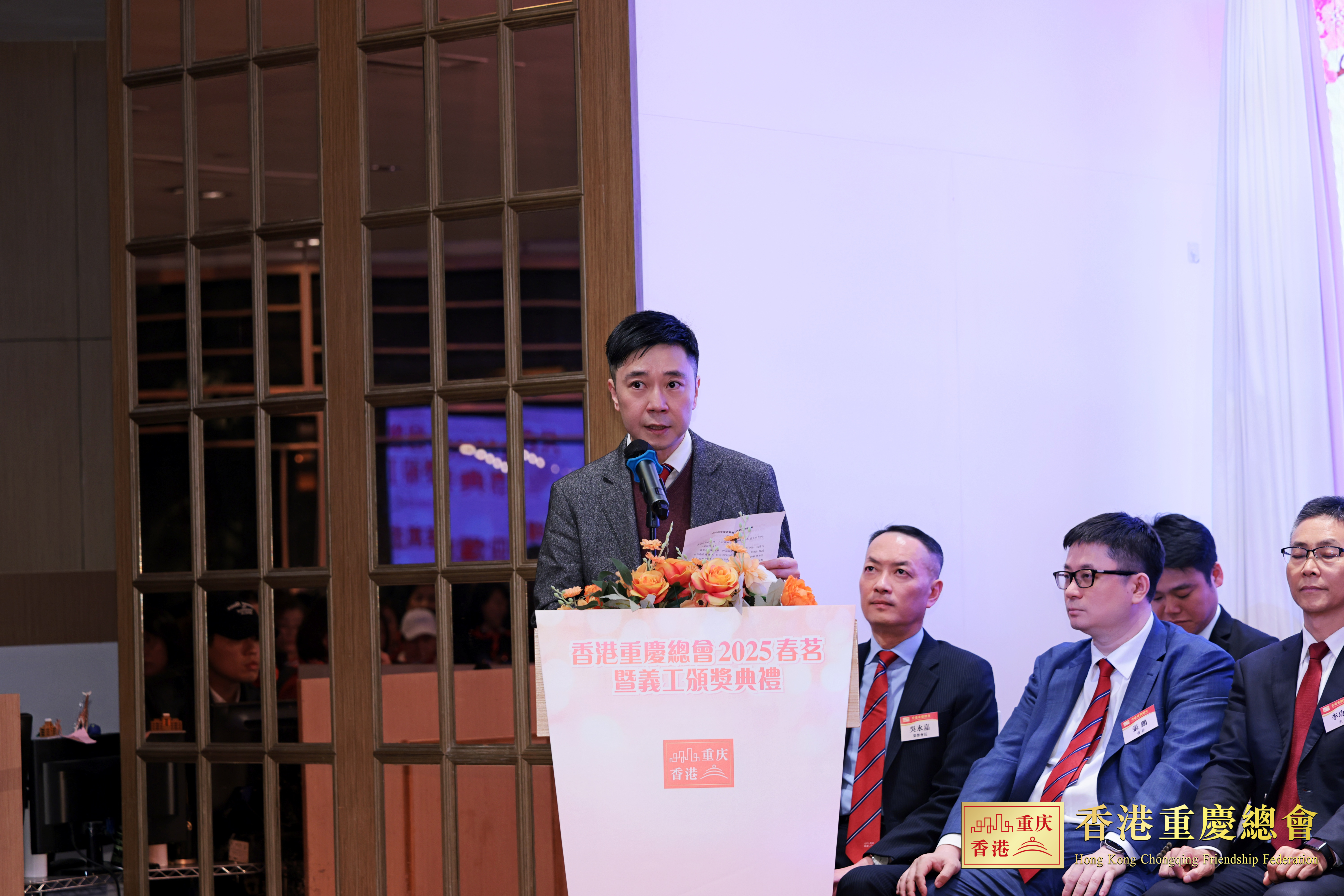 出席的主禮嘉賓包括全國政協委員、重慶市政協常委、香港重慶總會主席馬浩文,重慶市委統戰部副部長李康,中聯辦社聯部部長蘇玉軍、港島工作部副部長楊成偉、九龍工作部副部長郭長勇、新界工作部副部長李功勛,政制及內地事務局副局長胡健民,全國政協常委、北京社團總會會長施榮懷,新界社團聯會會長陳勇,港區省級政協委員聯誼會會長霍啟山,重慶市政協常委、香港重慶總會會長張鵬,全國人大代表、香港立法會議員吳永嘉,全國政協委員、香港重慶總會榮譽會長查毅超,江蘇社團總會會長姚茂龍,香港遼寧社團總會執行會長吳旭洋;香港福建社團聯會副主席林佑碧,重慶市委統戰部處長黃艷,香港立法會議員、香港重慶總會常務副會長鄧飛,重慶市政協常委、香港重慶總會常務副會長馮星航,香港重慶總會常務副會長李經緯、鄧雅文、向均羚,九龍城區議員、香港重慶總會副會長兼義工團團長關浩洋,屯門區議員、香港重慶總會副會長兼義工團副團長馮鈺鋒,全國婦聯代表、香港重慶總會副會長兼秘書長許小哲。