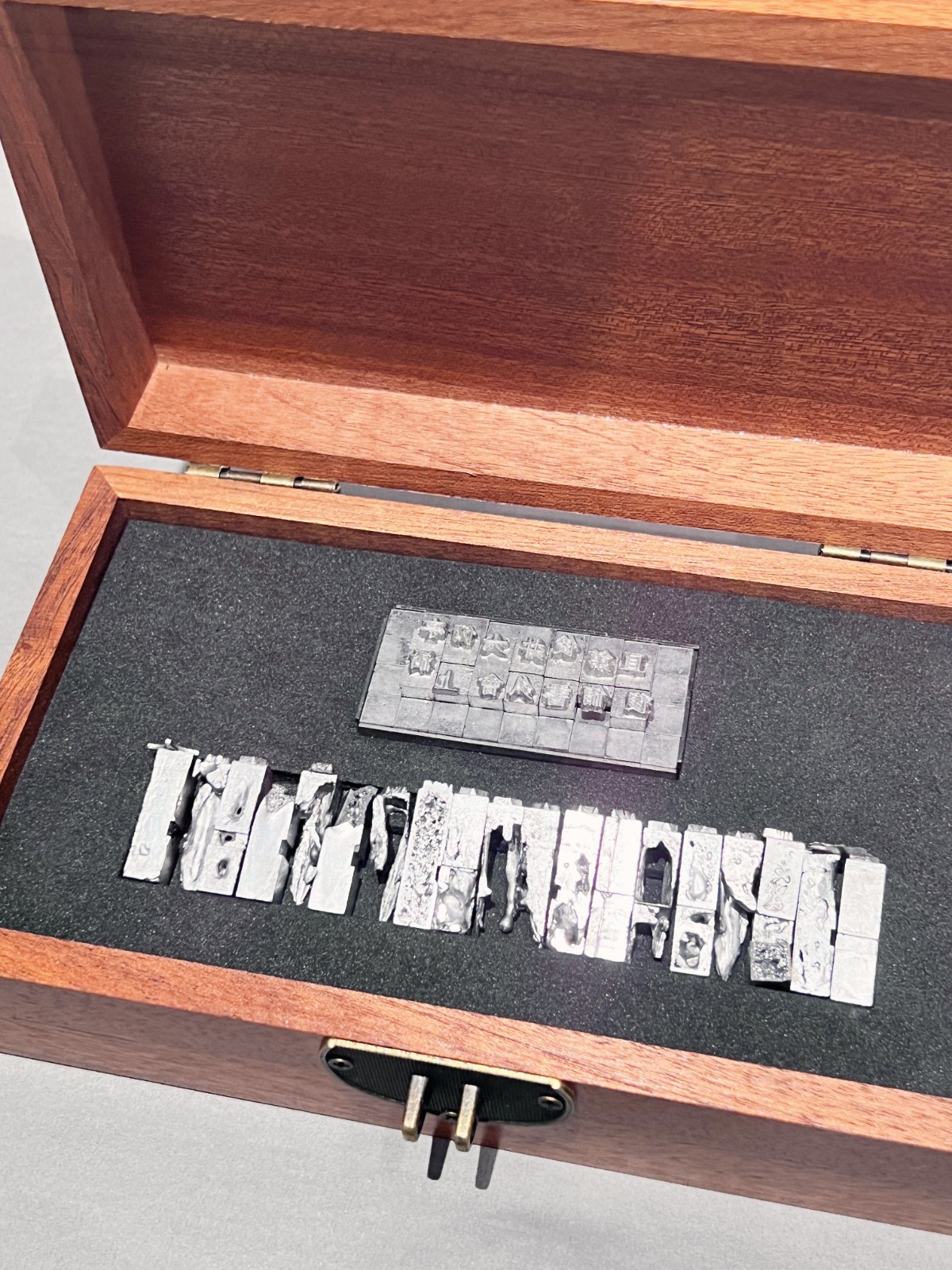 這些小小的鉛字粒雕工精細,翁秀梅指2020年曾與荷蘭韋斯特贊鑄字工房攜手研究重鑄香港字,惟重鑄工作比想像中更困難,百年的字模和現代的鑄字機難以相容。展覽展示了當時保存下來的「失敗」活字,見證了重鑄過程的困難。曾參與香港字重鑄計劃的鑄字學徒吳楚瑤,在2024年以玻璃鑄出香港字《峕(「時」的古字)》,展覽展示了這項大型鑄字作品。活版印藝師黃洛尹自2016年隨退休印刷師傅林安學習排印,2023年創作的參展展品《字》用近四千枚六號活字「描繪」光暗,體現她對文字結構的敏銳觀察。在新一代創作者手中,鑄字已非傳統的實用工藝,而是融入藝術創作中,在當代得以「重生」。
