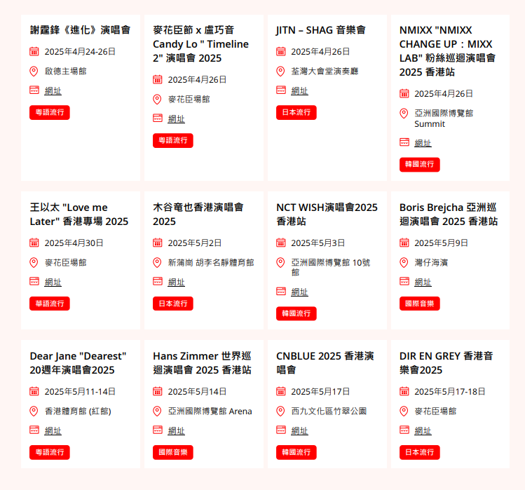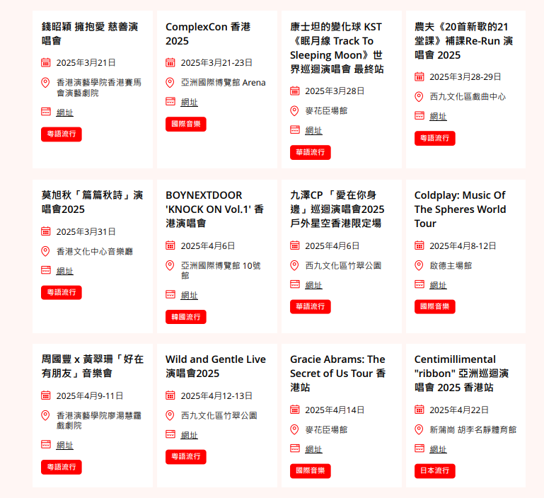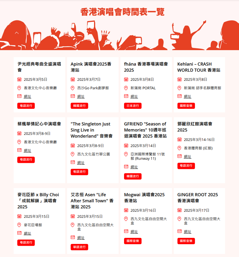 香港旅發局網頁推出「香港演唱會時間表」,公開今年在紅館、啟德體育園、亞洲國際博覽館等舉辦演唱會的歌手。