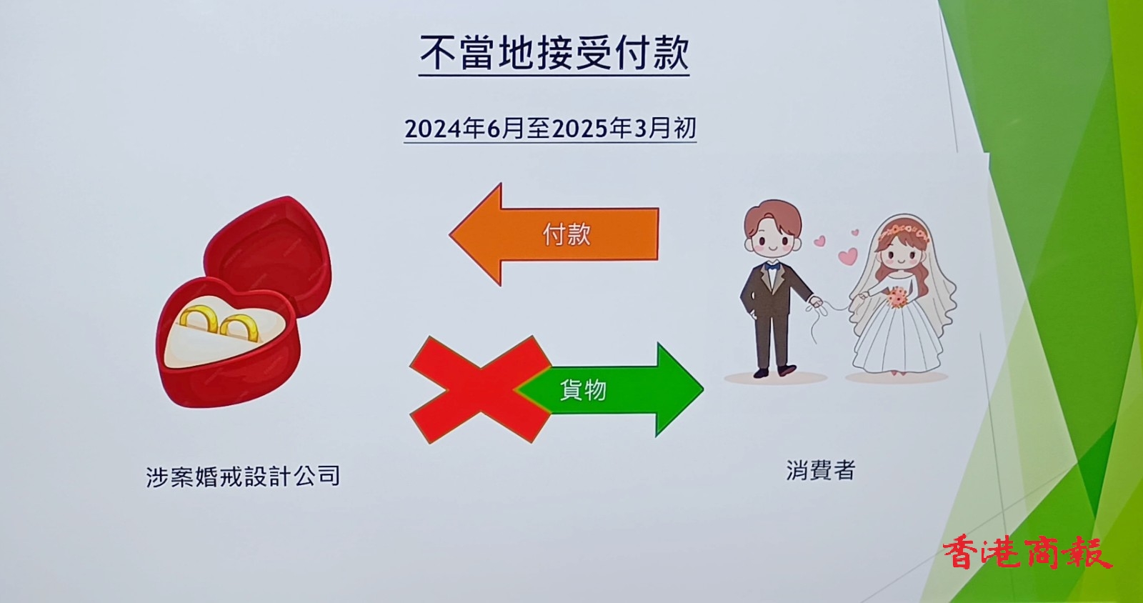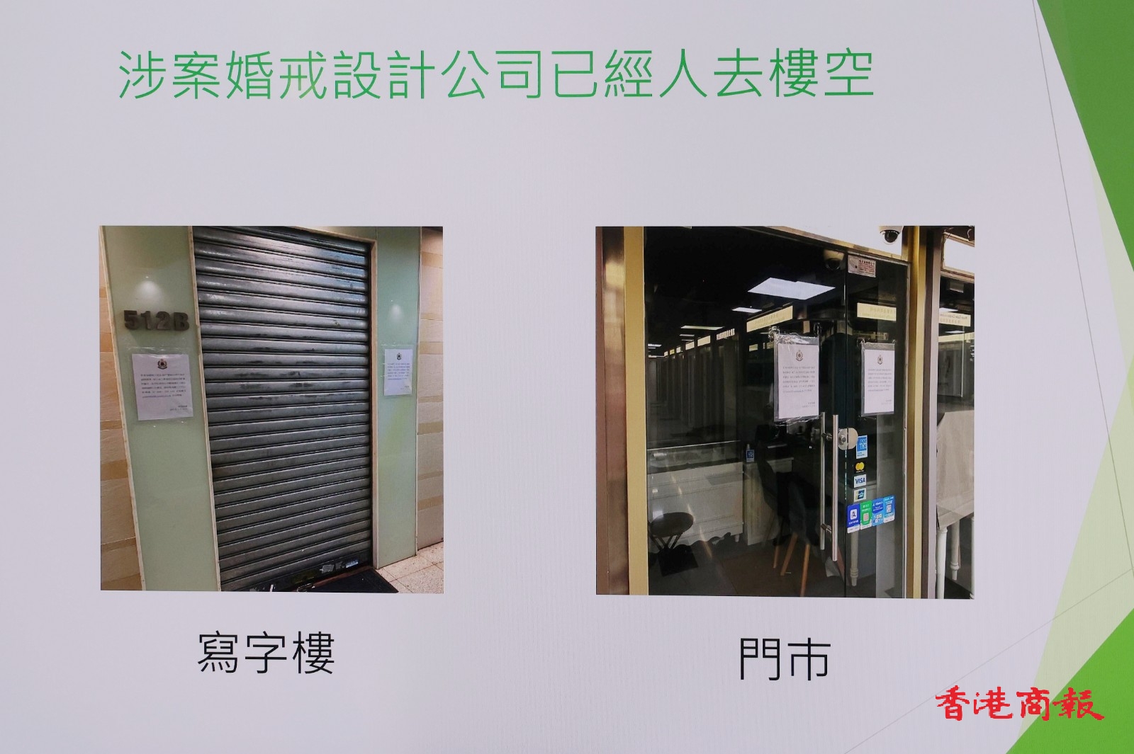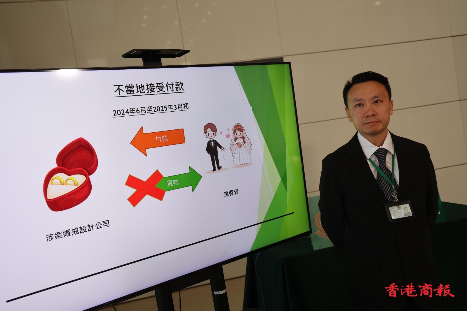 海關商品說明調查科署理高級貿易管制主任伍慧明今日(20日)表示,早前接獲多名市民舉報,指一間婚戒設計公司多次以各種理由,不斷延遲交付他們訂購的結婚戒指;至3月初更失去聯絡,顧客到其門市時發現已人去樓空,損失不單無法得到訂購的婚戒,同時亦沒有退款。
