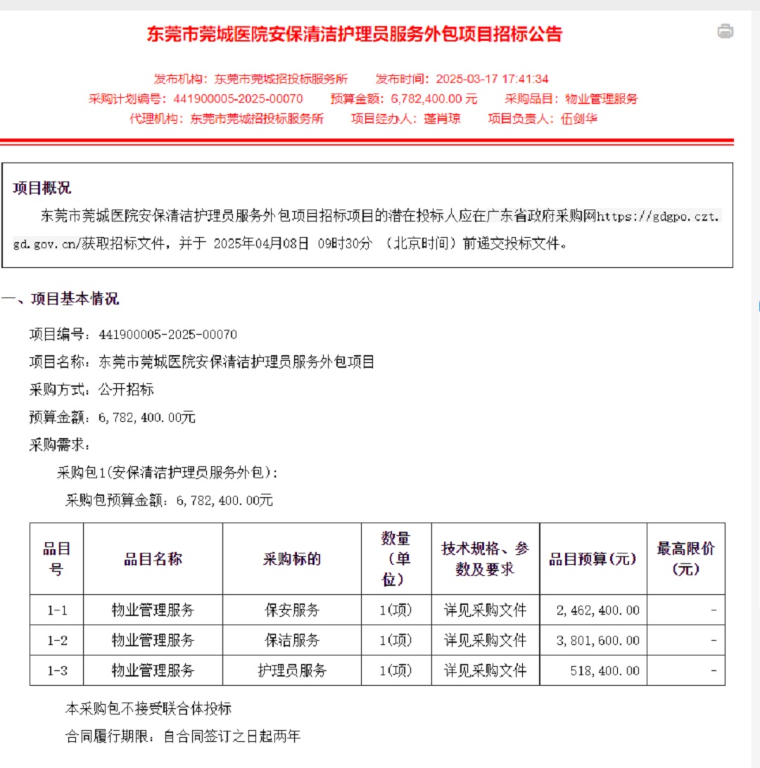 記者獲悉,《東莞市莞城醫院安保清潔護理員服務外包項目招標公告》(項目編號:441900005-2025-00070)發布機構為東莞市莞城招標服務所,預算金額為6782400元,服務期限是2年。《公告》對申請人的資格提出多項明確要求,其中第二項落實政府採購政策需滿足的資格要求中寫明:參與的供應商(聯合體)服務全部由符合政策要求的中小企業承接。