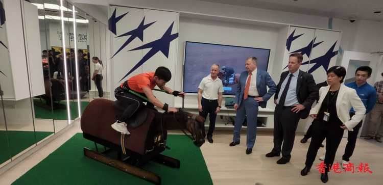 應家柏及後在夏定安、馬會見習騎師學校首席騎術教練高雅志陪同下參觀裝修好的馬房,他們又走進課室,觀看見習學員踏上馬匹訓練工具示範。應家柏鼓勵見習學員,努力向夢想進發。