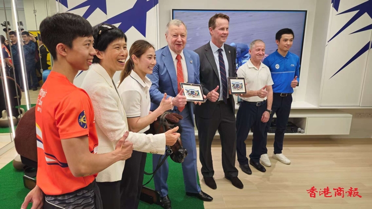 應家柏致辭後,和夏定安、身兼馬會賽馬人才培訓主管的見習騎師學校校長陳念慈,以及見習女騎師黃寶妮,一起進行揭牌和剪綵儀式。多位見習學員在馬房門前作功夫表演,姿勢有版有眼,為今天的活動錦上添花。
