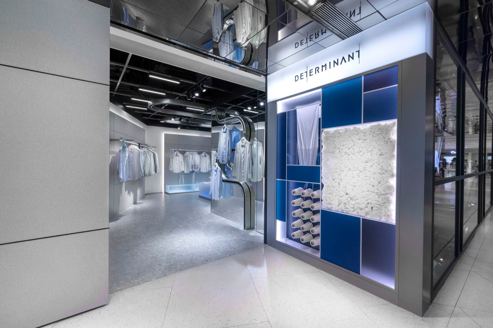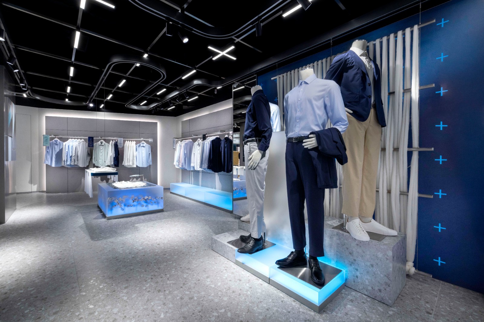 概念店透過裝潢展現了品牌製作襯衫的過程,試穿襯衫之餘,了解從原材料棉花到襯衫誕生的故事。簡潔現代的美學設計,融合玻璃、石材及金屬物料,配搭以生產線的輸送帶為靈感的天花板設計,及以棉花布置的陳列擺設,每一細節皆呈現在工藝、創新及品質的堅持。門面的櫥窗以放大鏡為主題,展現了組成襯衫的五個細節,包括衣領、肩膊設計、衣襟、鈕扣和袖口。此外,還設立了棉料體驗區讓顧客感受布料及工藝,LED結構圖裝置則詳細展示了Essential系列白襯衫的九個部件,呈現襯衫的製作細節及如何打造合身感。