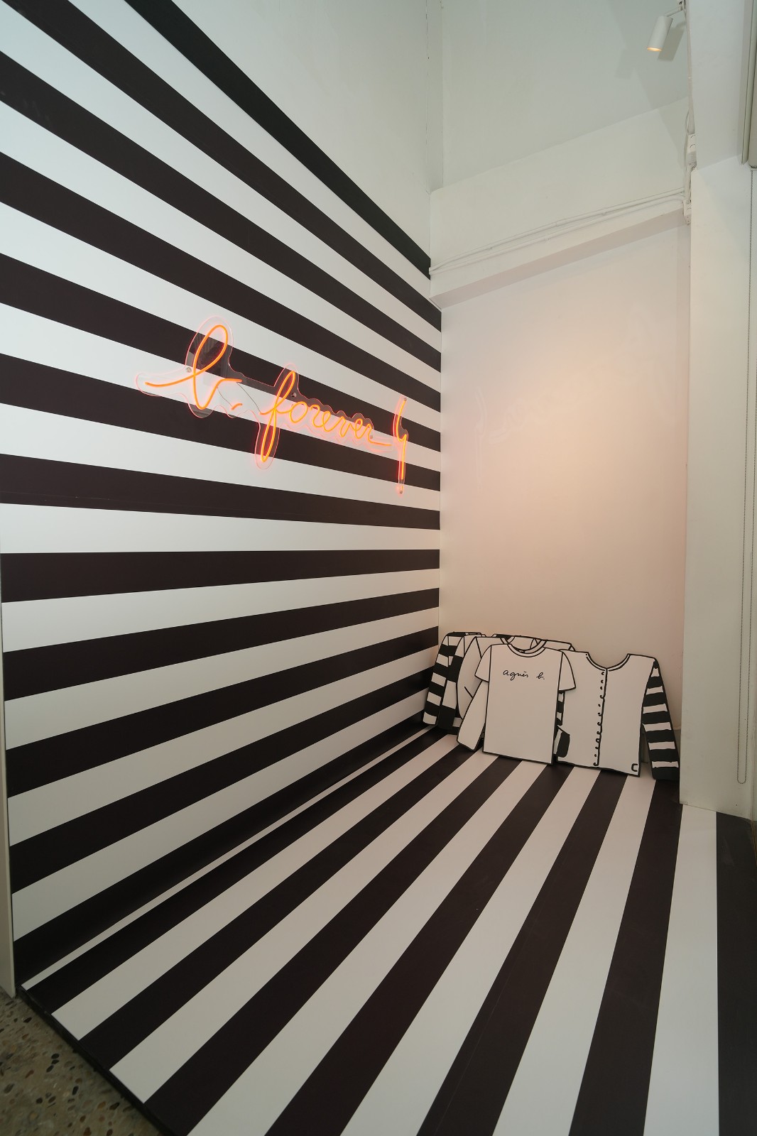 此外,品牌自2003年至2016年支持香港藝術中心電影院並成立「agnès b. cinema」,為深入展現與香港電影藝術的深厚淵源,此次展示多年來的電影海報、劇照與影院座椅。同時精選超過20件具代表性的歷史物品,涵蓋藝術與電影,包括在香港首家店舖推出的T恤及跨界合作,展現其對本土藝術的支持。展覽亦回顧品牌自1975年以來的發展歷程,從於巴黎開設第一間服裝店發展至今的故事,打造了一面由歷史照片、雜誌剪報與報道組成的展區,加入多段珍藏影片,為展覽增添許多細節。
