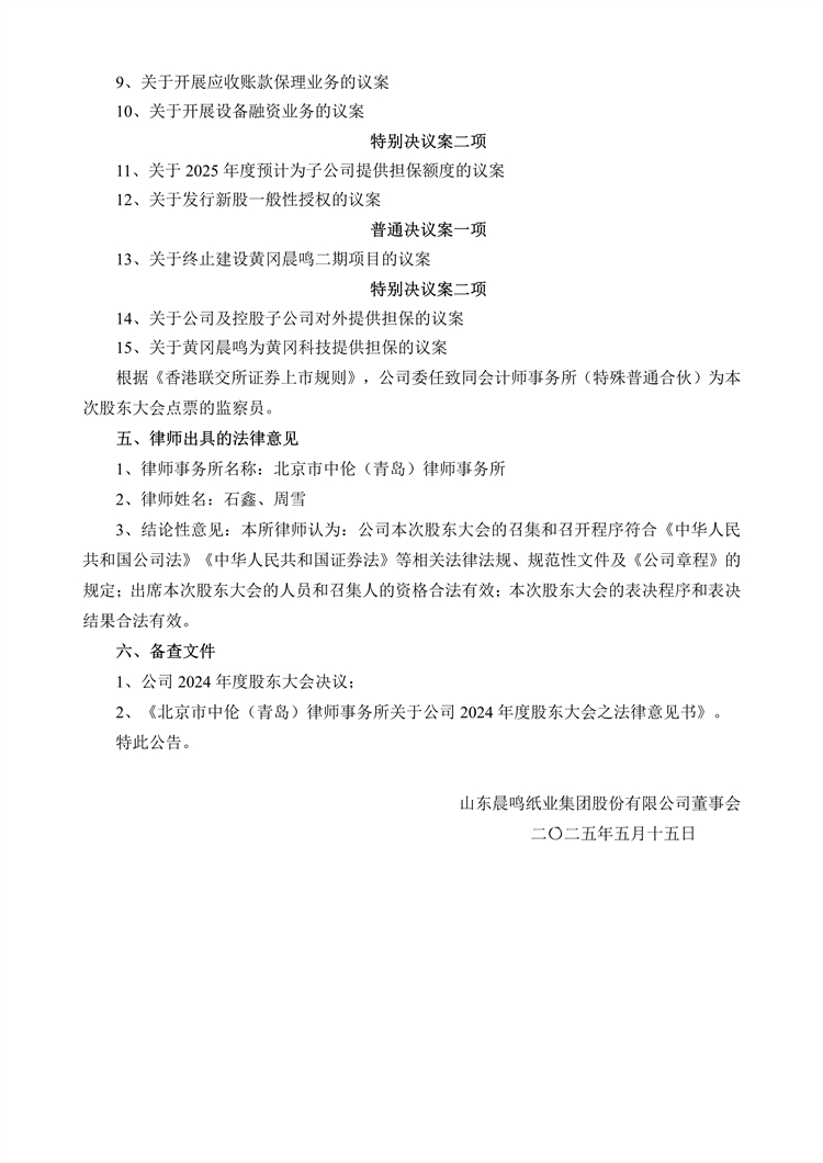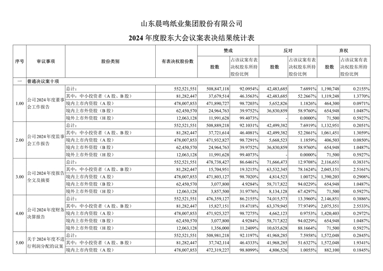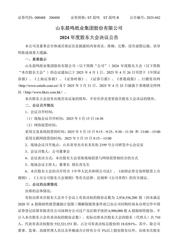 山東晨鳴紙業集團股份有限公司 2024年度股東大會決議公告