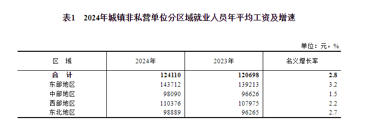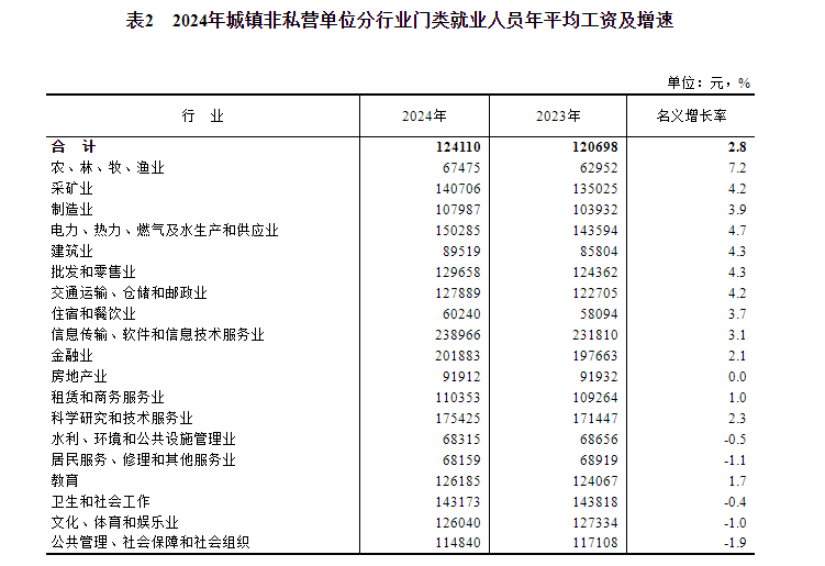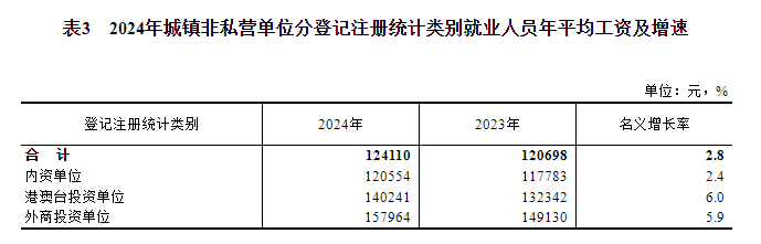 2024年,全國城鎮非私營單位就業人員年平均工資124110元,比上年增加3412元,名義增長2.8%,按可比口徑增長2.6%。