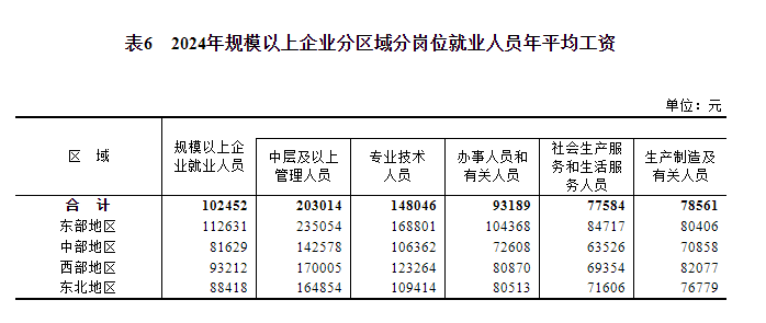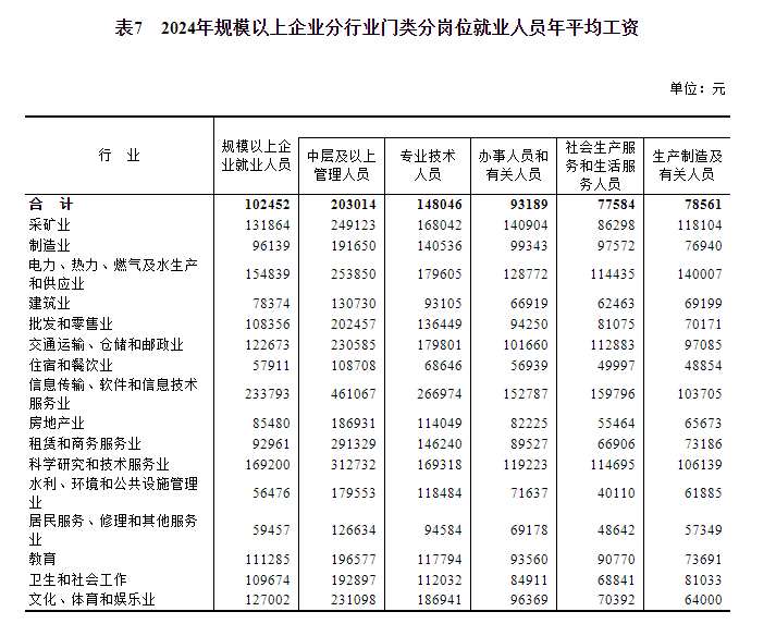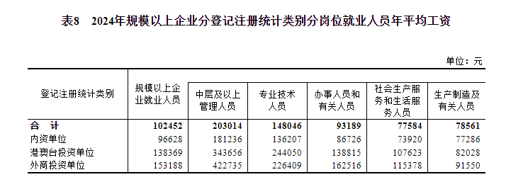 2024年,規模以上企業就業人員年平均工資為102452元,比上年增加4356元,名義增長4.4%,按可比口徑增長4.2%。其中,中層及以上管理人員203014元,增長2.4%;專業技術人員148046元,增長5.0%;辦事人員和有關人員93189元,增長4.1%;社會生產服務和生活服務人員77584元,增長3.1%;生產製造及有關人員78561元,增長4.1%。