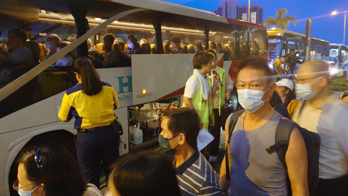 大批受影響乘客在港鐵站外等候接駁巴士。(西貢區議員張美雄社交媒體圖片)