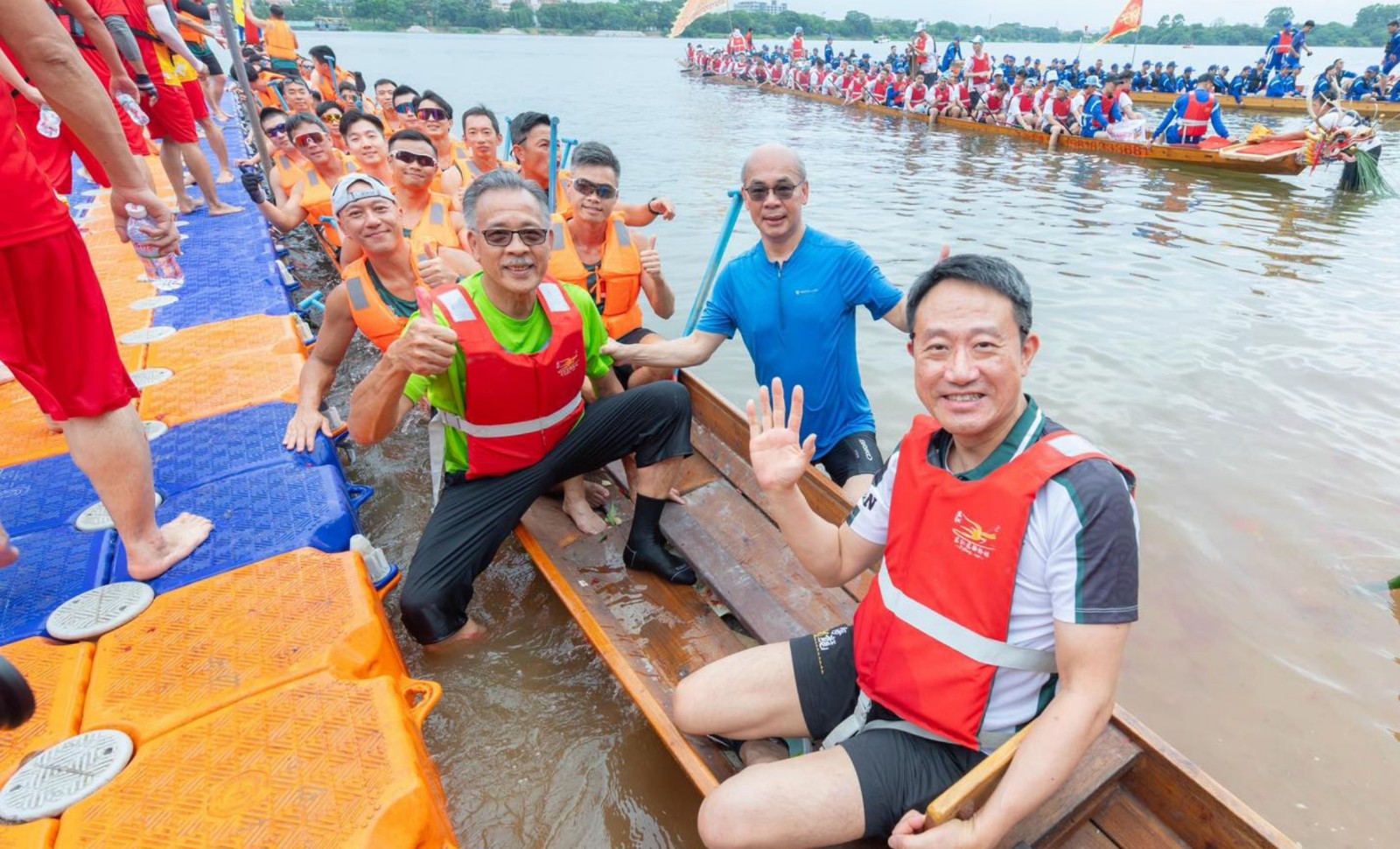 陳子達主持活動開幕儀式,更親自坐鎮龍舟之首,與海關健兒一同在傳統大型龍舟揮槳,與內地龍舟隊伍在東江上較勁,增進聯繫和友誼。(記者區天海)