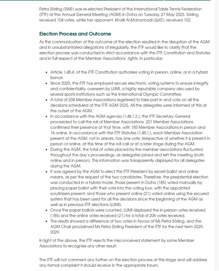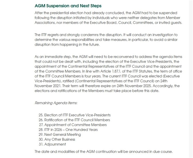 聲明表示,國際乒聯現階段不會就選舉程序發表任何進一步評論,並將在適當的管道處理收到的任何正式投訴。作為緊急措施,需要重新召開年度大會,以處理未能完成的議程項目,包括選舉執行副主席、任命國際乒聯理事會各大洲代表以及任命委員會成員。
