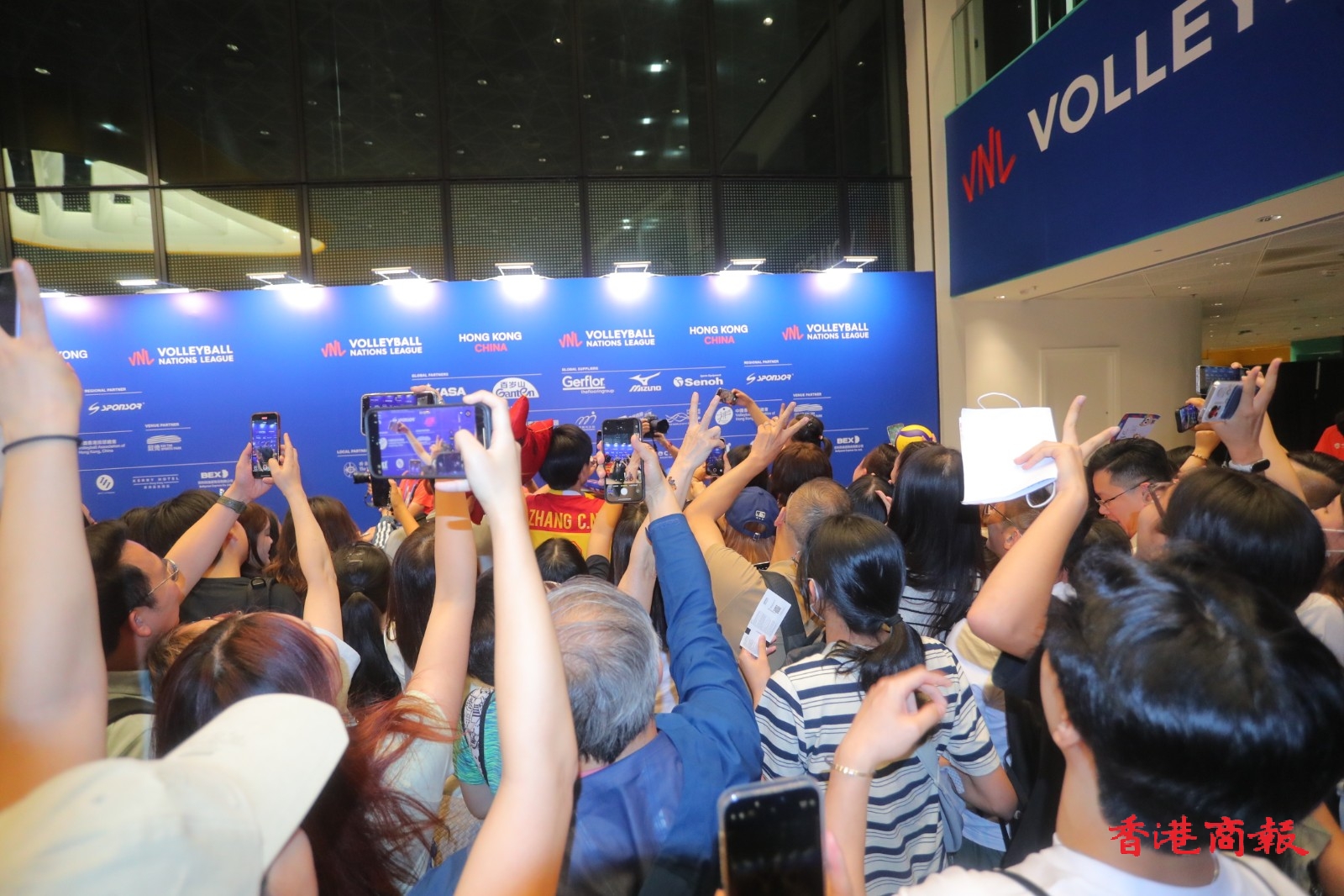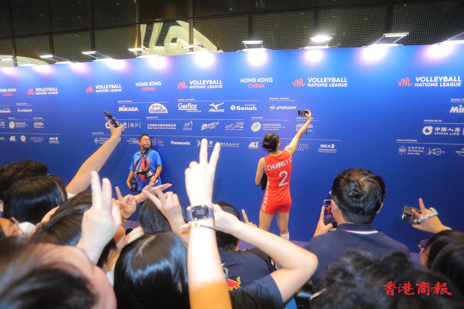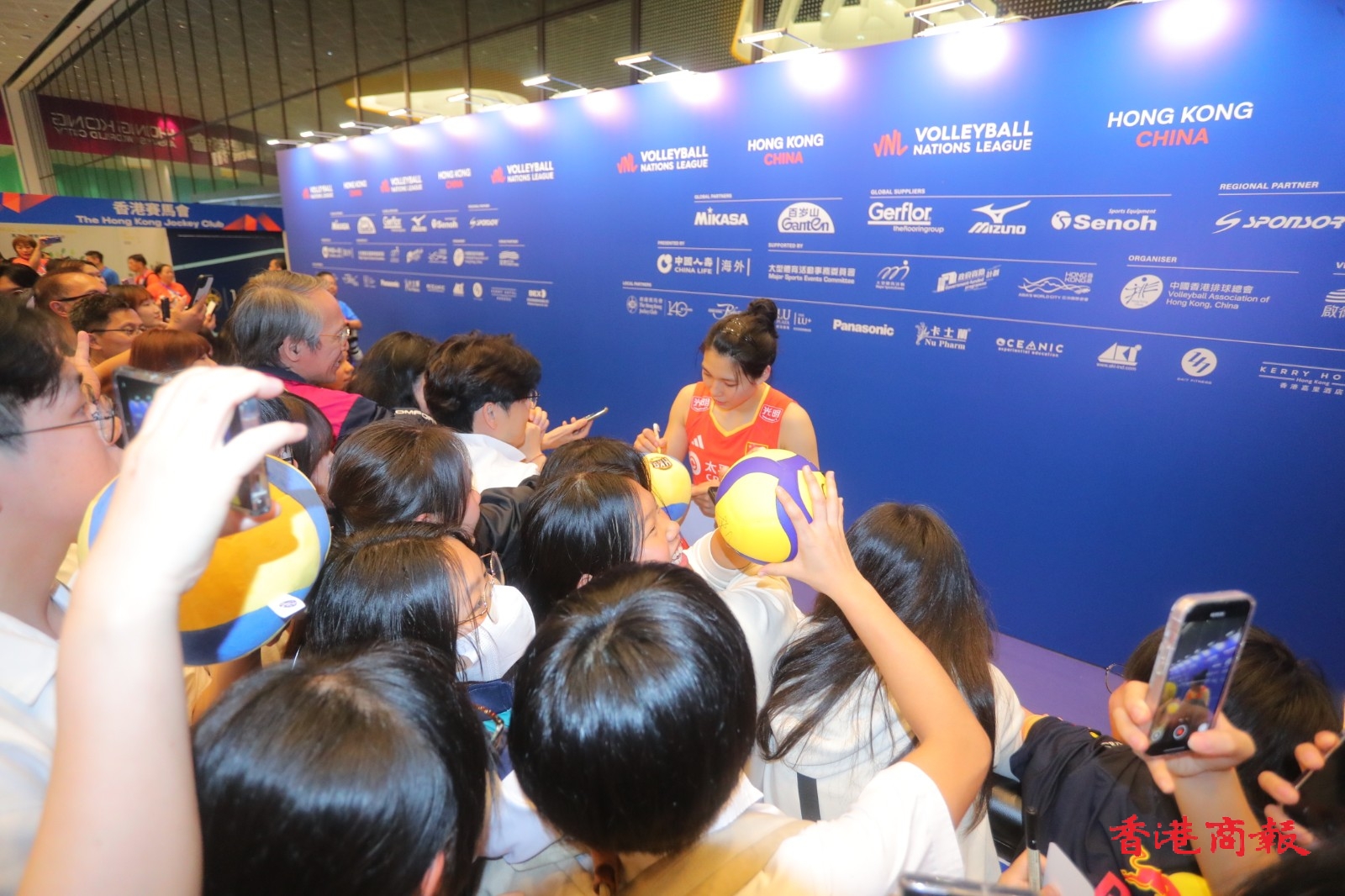 一連5日的「中國人壽(海外)世界女排聯賽香港2025」18日於啟德體藝館舉行,當日晚上的壓軸戲,中國女排以3比1擊敗捷克,在香港站取得開門紅。中國女排一眾球員賽後與眾同樂,有求必應與球迷自拍、簽名,令現場球迷陷於瘋狂,當中王媛媛出動自拍神器,更令大家狂叫,場面非常歡愉。(文/圖/片:志誠)