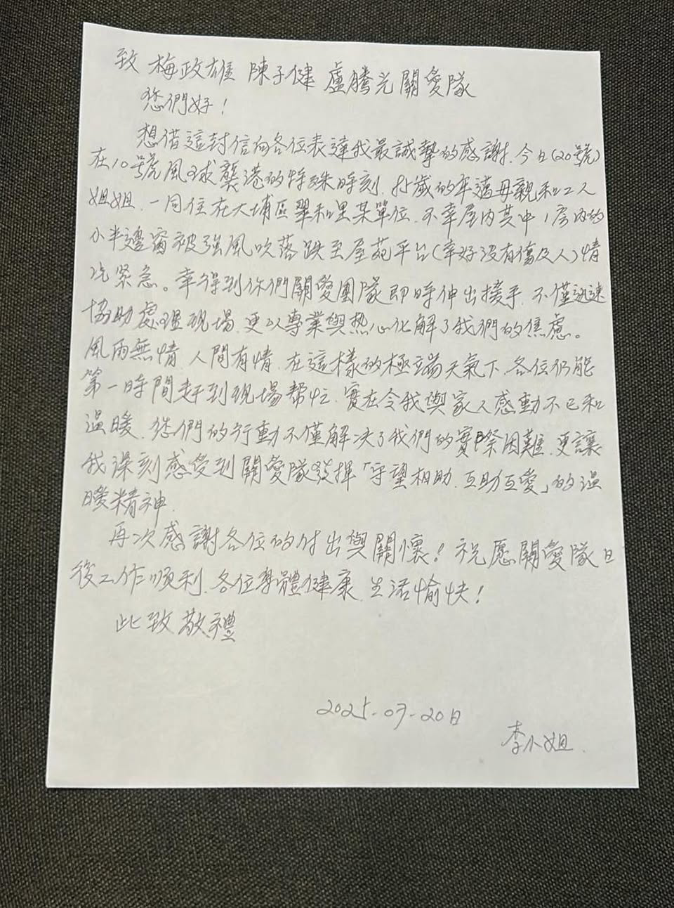 據了解,關愛隊成員收到街坊求助,稱其年邁母親與傭工居於大埔舊墟的單位房間有窗戶飛脫跌到街上,另外兩隻窗亦無法關上。婆婆年紀大行動不便,其女兒非常擔心,所以聯絡大埔舊墟及太湖區關愛隊。關愛隊知道情況後聯絡產婆婆及報警。多支大埔區關愛隊同一時間彼此溝通,由附近區議員兼關愛隊成員跟進,在安全情況下雖有10號風球但帶齊工具到單位,確認住戶安全,並幫忙圍封窗框已跌落街的窗口位置,避免狂風暴雨造成人身和財物損害。求助街坊事後親筆寫上感謝信,感謝和讚揚關愛隊風雨無阻向有需要街坊伸出援手,展現「風雨無情,人間有愛」。