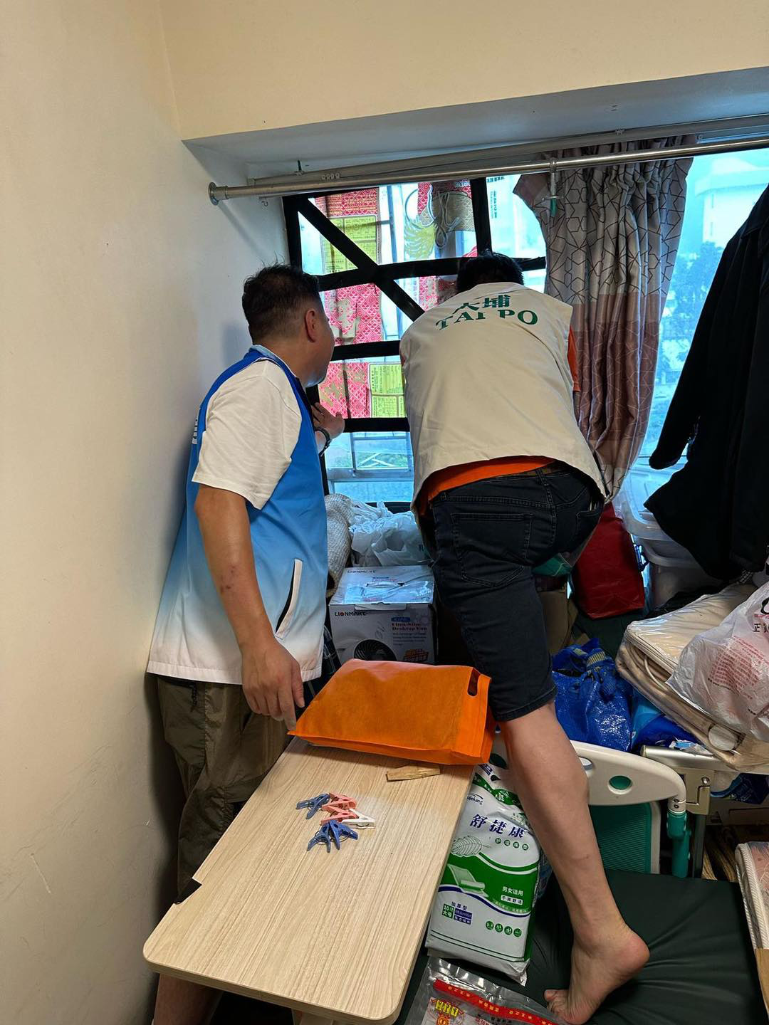 此外,大埔富亨邨有居民家中窗鉸受強風損壞不能夠關窗、窗框幾乎飛脫的驚險情況。關愛隊即時安排兩位住同一大廈的隊員到場協助,情況緊急下暫時利用住戶家中的麻雀板封緊窗口作臨時措施,避免強風對單位造成破壞並危害屋內住戶安全。成功化險為夷後,居民於網上平台特別感謝關愛隊幫助。