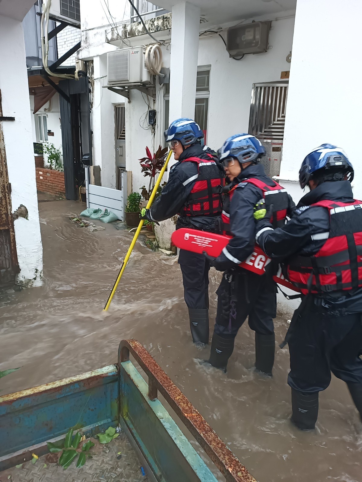 民安隊表示,在颶風信號懸掛期間,民安隊派員分別在大澳、鯉魚門、沙頭角及荃灣,處理多宗民居水浸和倒樹事件。隊員們全力以赴,協助居民排水和搶險,確保社區的安全和穩定。