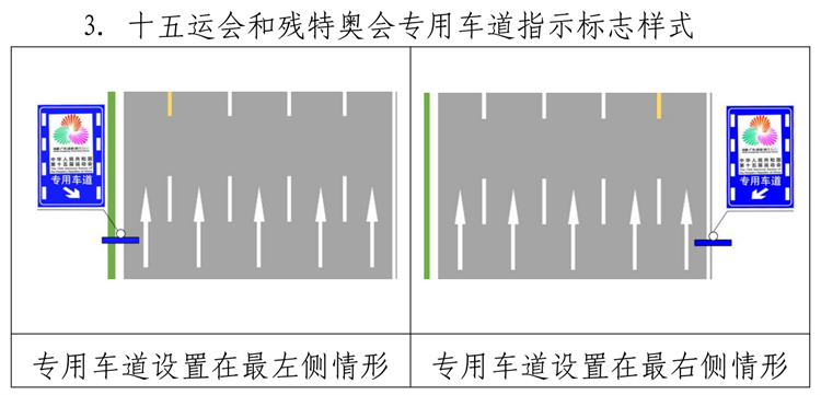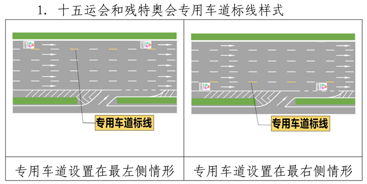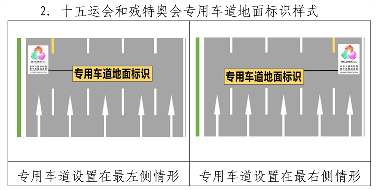 十五運會和殘特奧會專用車道標線由黃色、白色間隔虛線組成,地面標識為白底彩色十五運會和殘特奧會會徽圖案組成,指示標誌由藍底(或綠底)白色虛線、箭頭及白底彩色會徽組成。