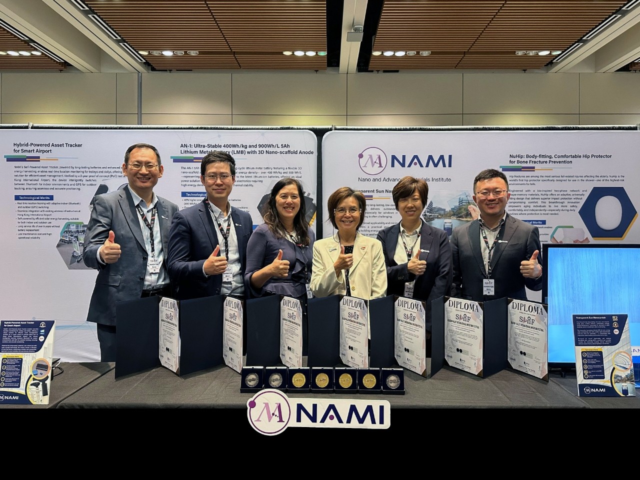 NAMI此次展出多項創新技術,涵蓋醫療保健、電池材料、先進電子及可持續材料等領域。在榮獲金獎的項目中,智慧機場自供電資產追蹤系統,它結合長壽命電池與太陽能技術,室內藍牙與室外GPS可無縫切換,實現機場手推車可隨時追蹤;NuHip:貼身、舒適、可預防骨折的髖部保護器採用仿生雙相網絡及形狀記憶材料,貼合身體,提供出色防衝擊保護,淋浴可用;透明透光納米窗簾採用噴塗式施工玻璃塗層,阻擋50%太陽輻射,保留60%可見光穿透率,反射率低於6%;NAMI-SUPERTHERM浸沒式冷卻液用於AI伺服器及高性能電腦,安全、無毒、不易燃,提供卓越熱管理。