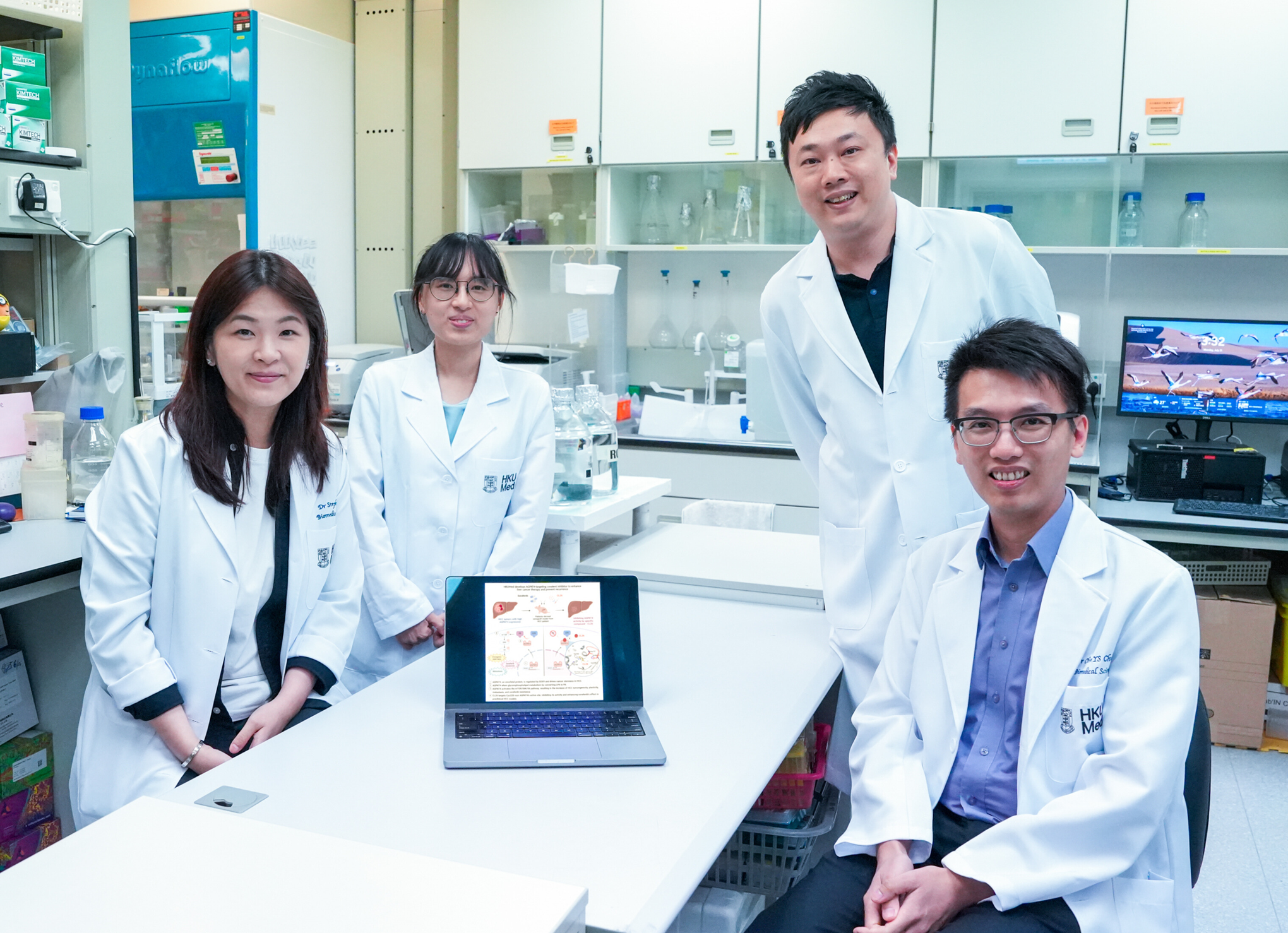 頂圖:港大醫學院研究人員識別肝癌抗藥性關鍵蛋白,並研發抑制劑增強治療效果和防止癌症復發。研究由馬桂宜教授(右二)和鍾亦琛教授(右一)共同領導。