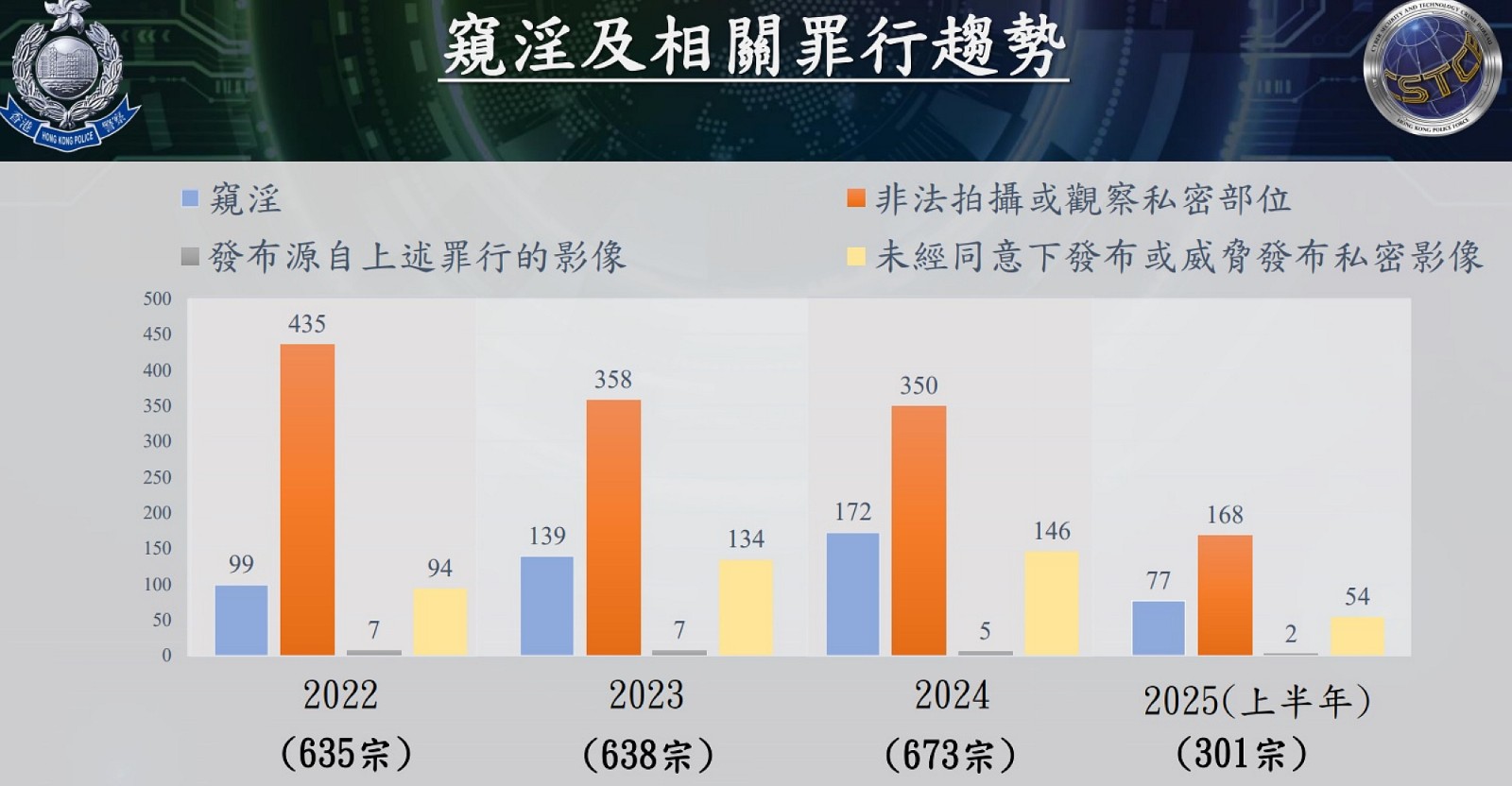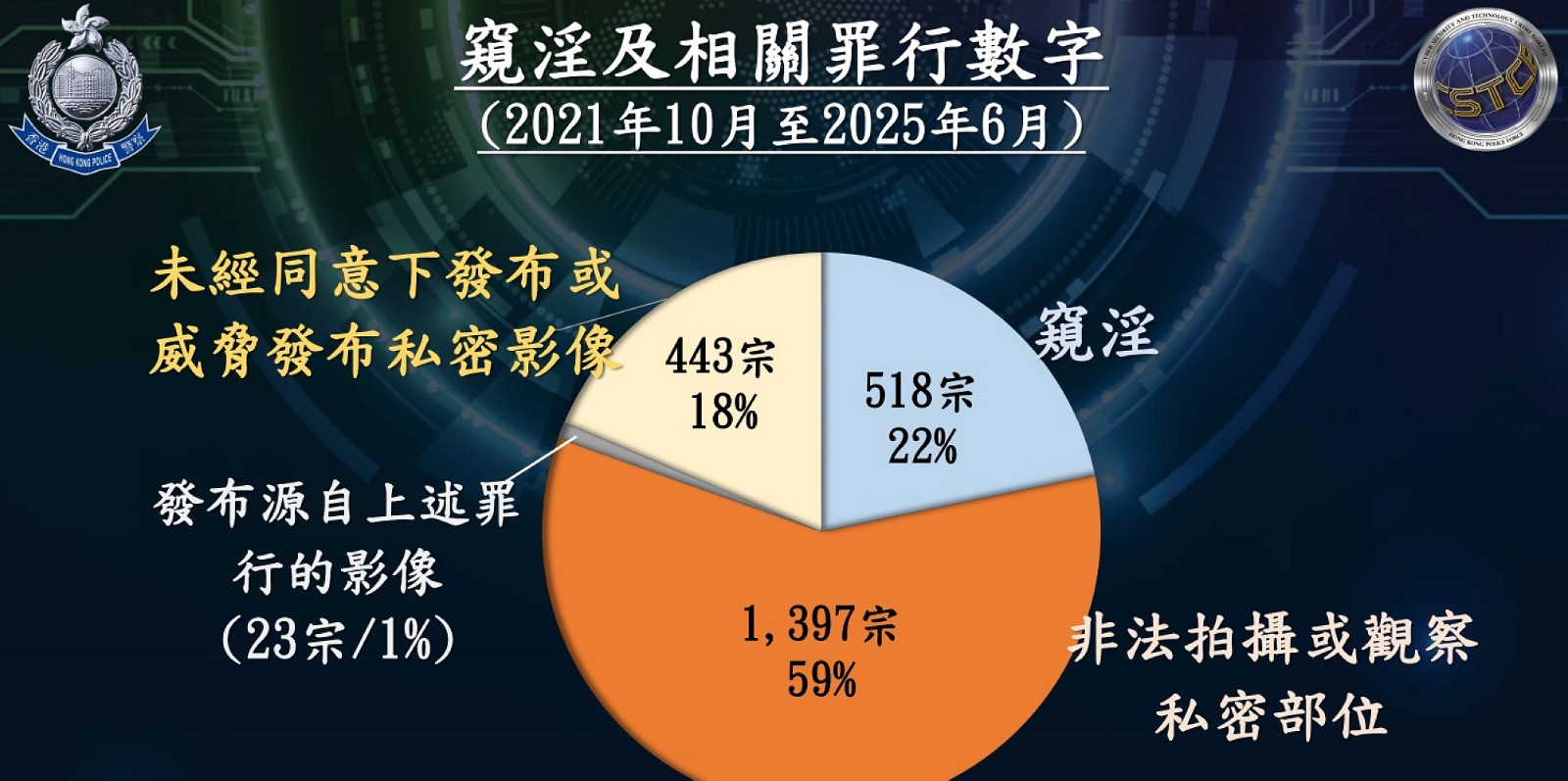 網絡安全及科技罪案調查科科技罪案組高級警司李經晞今日(21日)表示,《刑事罪行條例》第200章中與窺淫相關罪行於2021年10月生效,過去3年警方每年接獲約650宗案,逾半涉「非法拍攝或觀察私密部位」、22%涉「窺淫」、18%涉「未經同意下發布或威脅發布私密影像」罪。在本年上半年接獲301宗,比去年同期343宗下跌12%。