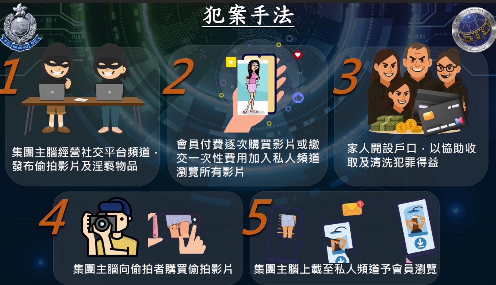 網絡安全及科技罪案調查科科技罪案組警司張巧儀表示,經過情報分析發現犯罪集團在社交平台開設免費公開頻道招攬會員,在頻道內發布不同色情主題預覽影片及相片,除淫褻不雅物品外,還包括學生裙底偷拍相。會員可透過繳交一次性會員費成為私人頻道VIP會員,瀏覽頻道內所有影片及相片。此外,如會員對個別影片或相片有興趣,亦可逐次付費購買。根據調查,該社交平台頻道已營運3年,至今會員人數接近9000人。