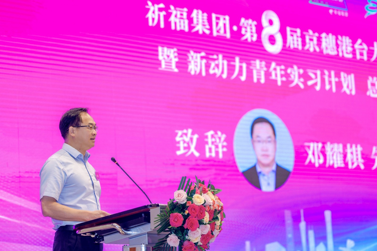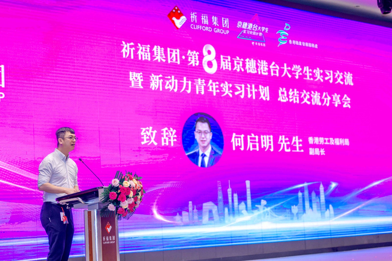 香港勞工及福利局副局長何啟明先生在致辭中表示:我們非常感謝祈福集團給予香港同學實習機會,讓他們在這裏服務、工作,我們更希望以後同學們有機會,繼續在祈福、在大灣區工作,也歡迎到灣區之中的香港……祈福集團給民心融合做了一個很好的示範作用,未來讓我們一起助力促進民心相通!