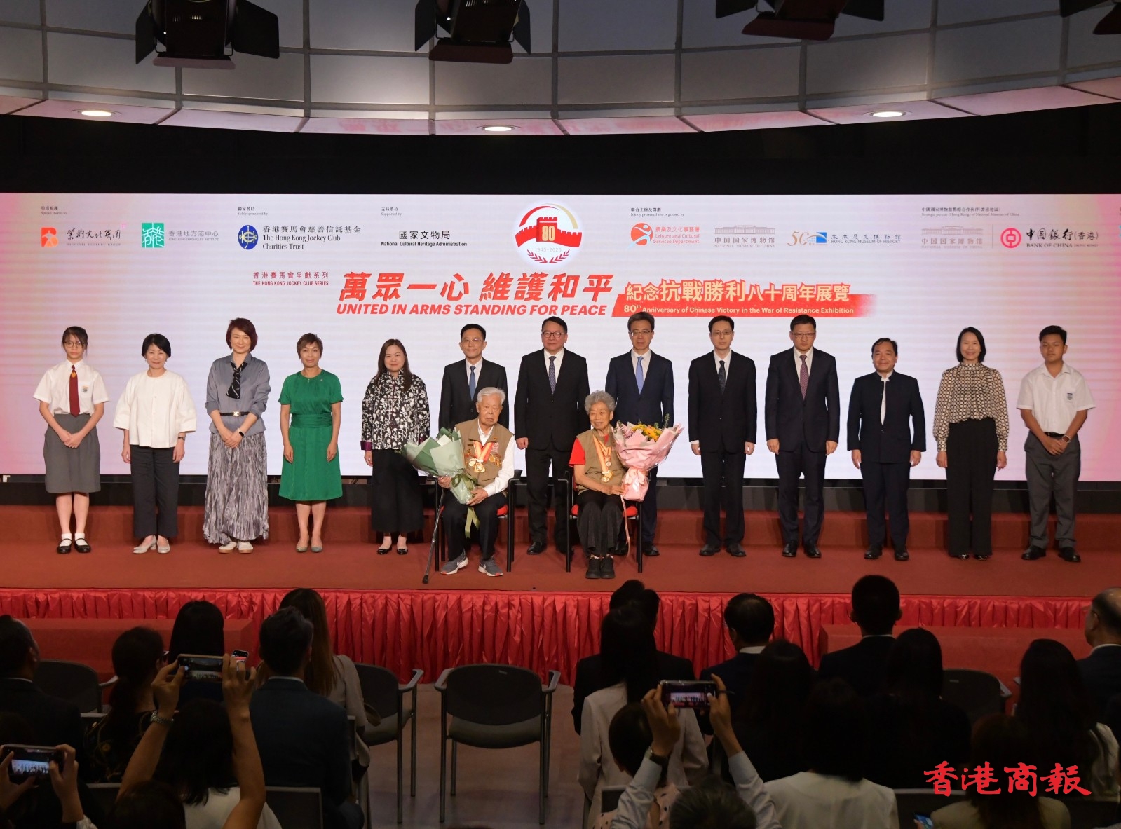 政務司司長陳國基(後排中)、中聯辦秘書長王松苗(後排左六)、國家文物局副局長孫德立(後排右六)、文化體育及旅遊局局長羅淑佩(後排左五)、中國國家博物館黨委書記楊帆(後排右五)、香港賽馬會董事龔楊恩慈(後排左四)等,與曾參加抗戰的老戰士(前排)在「香港賽馬會呈獻系列:萬眾一心 維護和平─紀念抗戰勝利八十周年展覽」的開幕禮上合照。記者 崔俊良攝