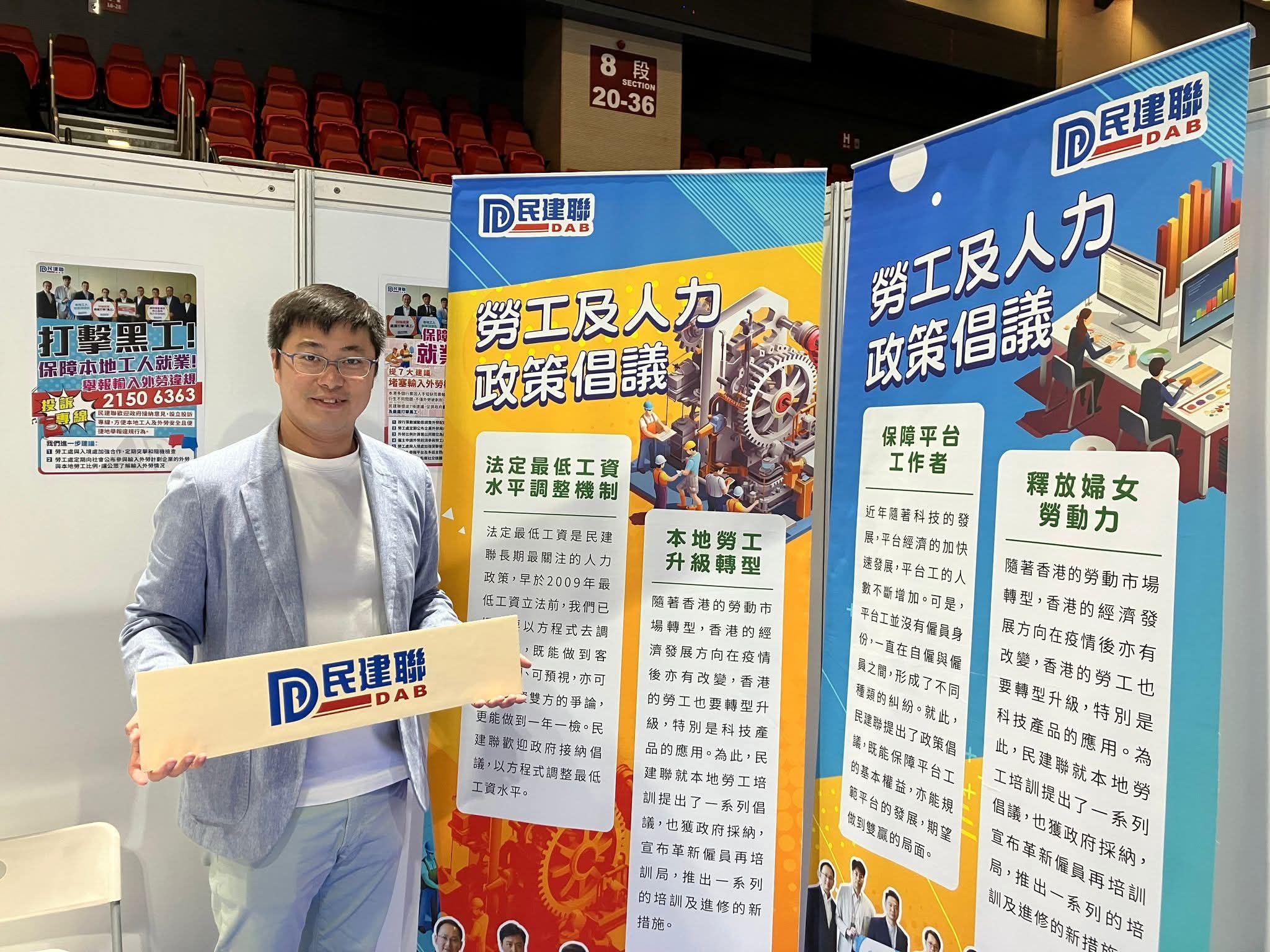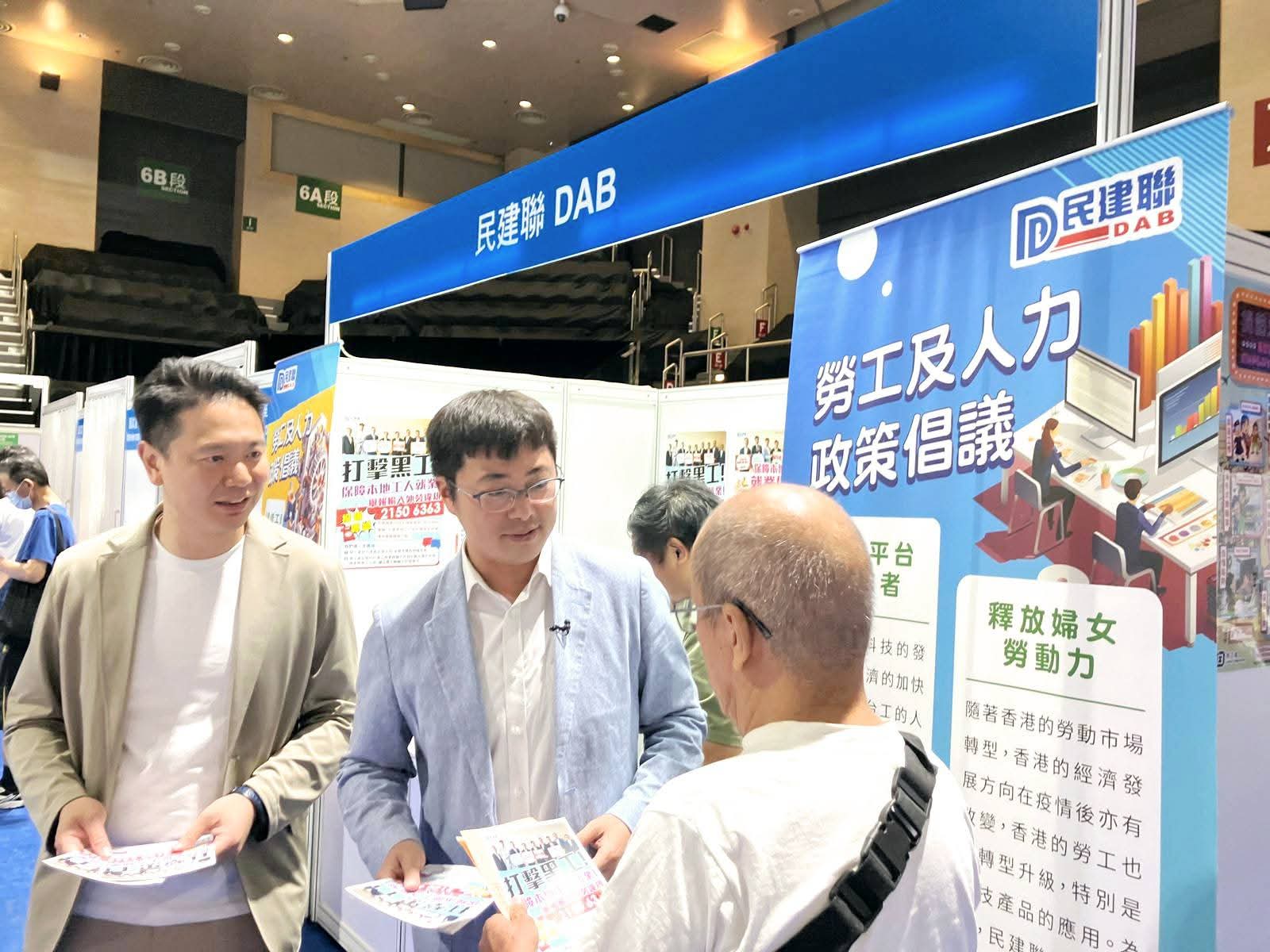 民建聯與勞工處合辦「職啟未來招聘會」,共超過60間機構參與,提供超過3100個不同行業的職位空缺,當中逾2000個來自飲食業、零售業及運輸業。今早(28日),民建聯副主席周浩鼎、陳恒鑌,聯同該黨立法會議員顏汶羽,陪同勞工及福利局副局長何啟明,到招聘會為勞資雙方加油打氣。