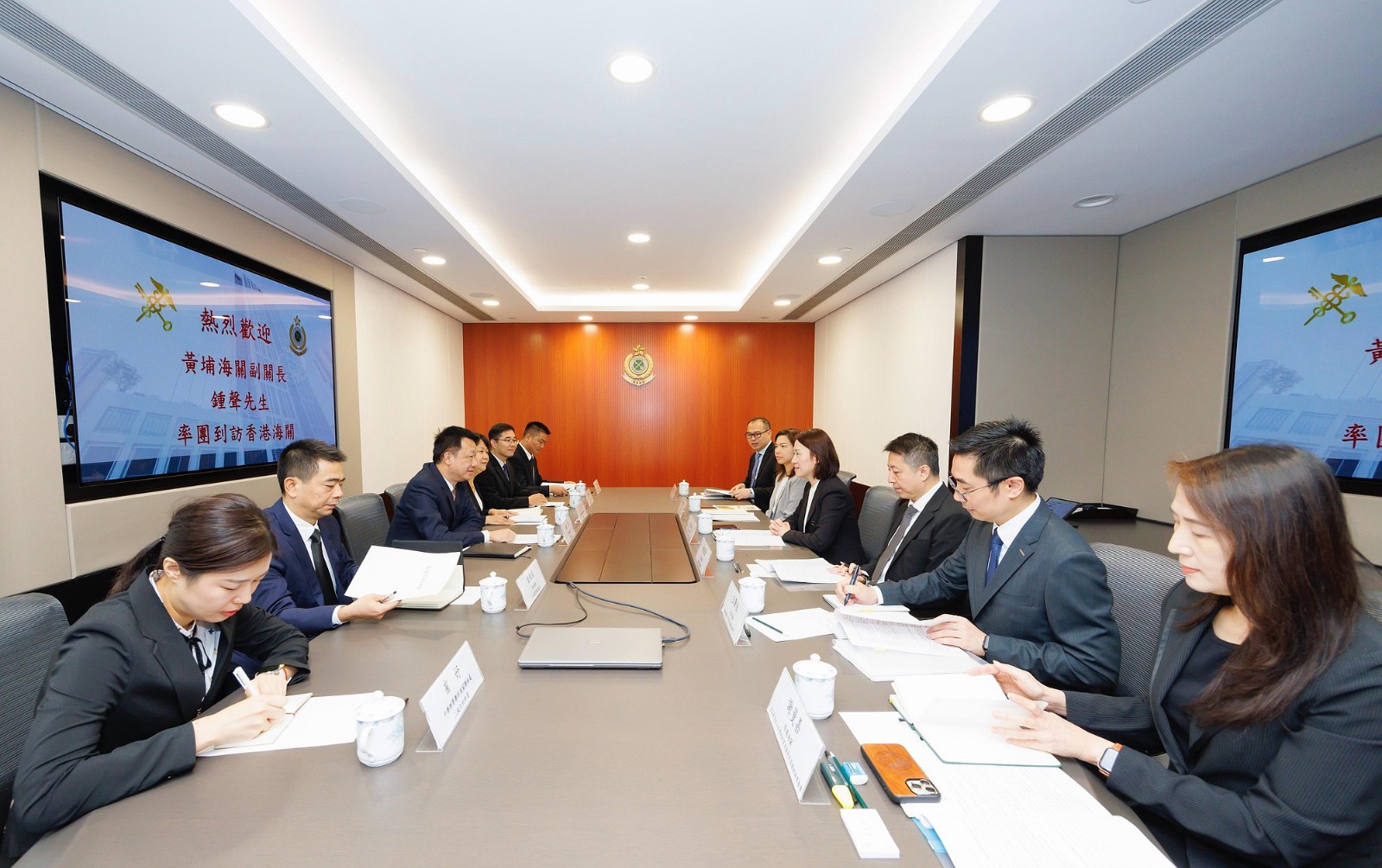 黃埔海關副關長鍾聲昨日(28日)率領黃埔海關代表團到訪香港海關。香港海關署理副關長(管制及執法)蔣依莉歡迎代表團到訪,並就共同推進「香港國際機場東莞空港中心」發展和合作進行交流,以進一步提升「海空貨物聯運」清關服務,發揮香港的空運中轉樞紐功能,開拓粵港澳大灣區物流發展的新機遇。