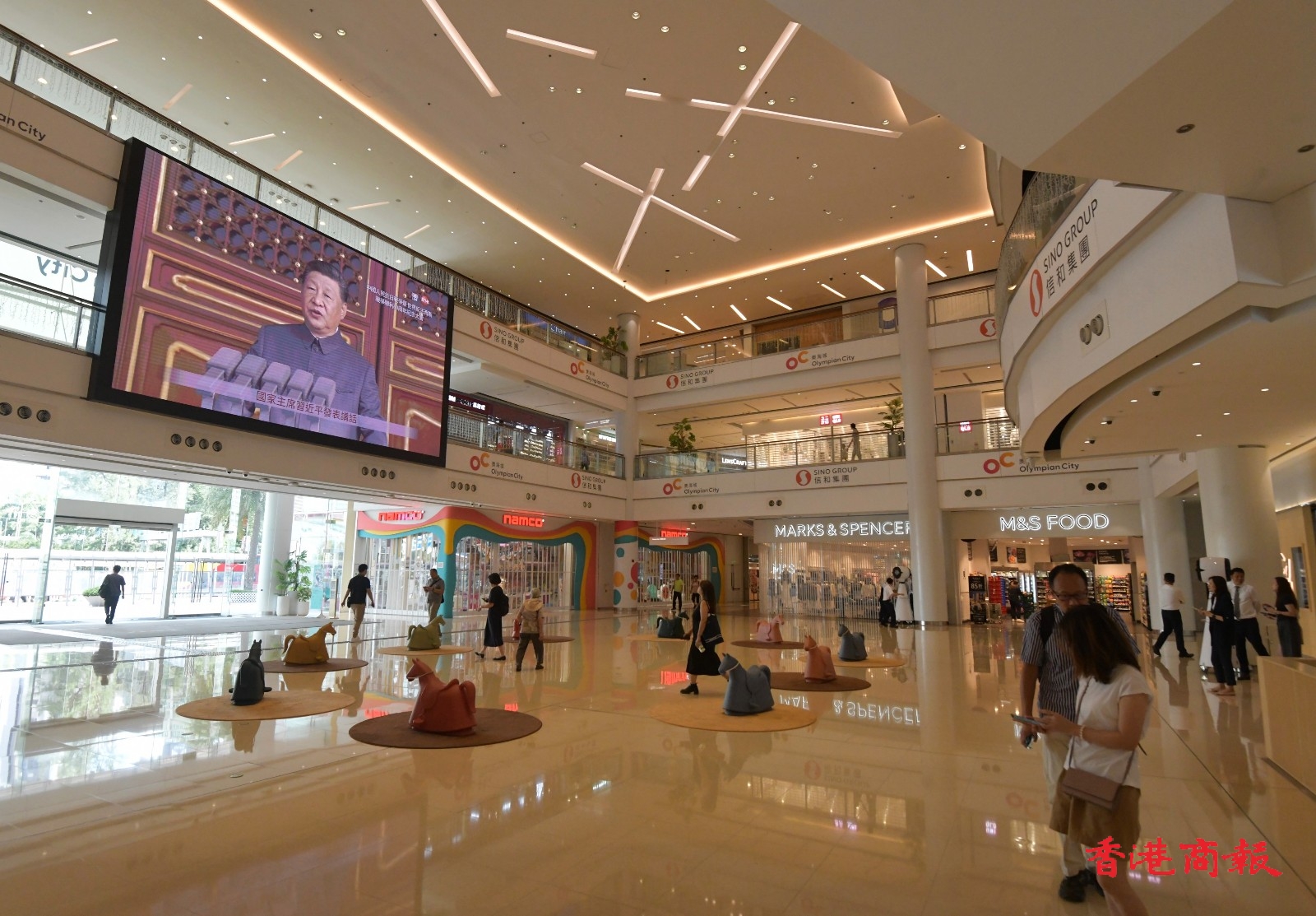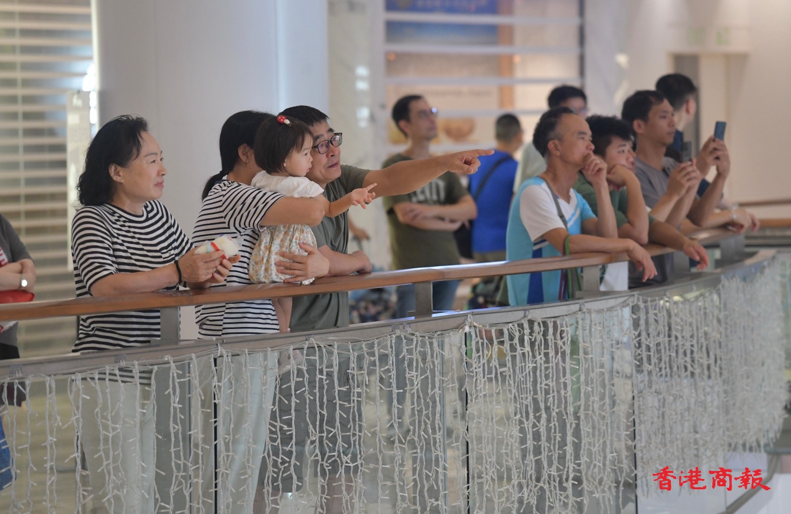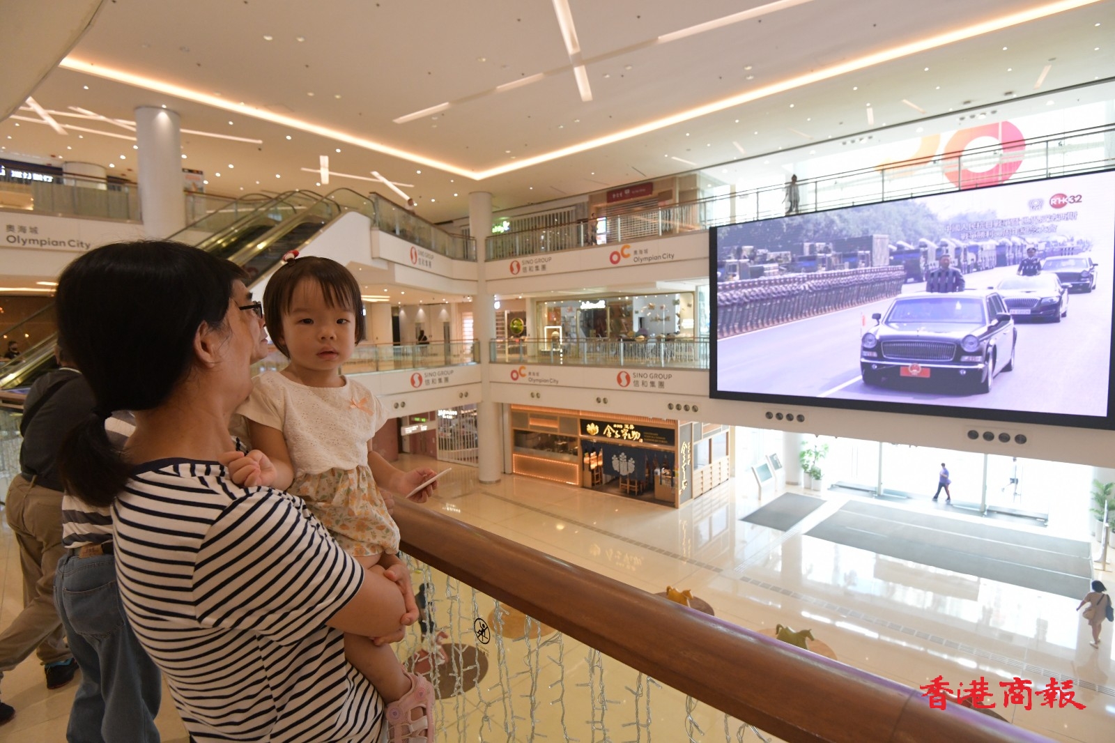 紀念中國人民抗日戰爭暨世界反法西斯戰爭勝利80周年大會今日(3日)在北京天安門廣場隆重舉行。圖為香港市民在奧海城商場觀看九三盛大閱兵直播。(記者崔俊良攝)