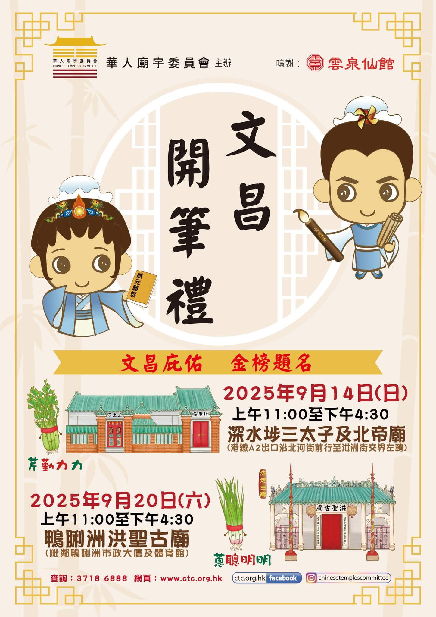 民政及青年事務局轄下的華人廟宇委員會,為了承傳傳統習俗,並向大眾推廣傳統文化及發揚勤學向上的美德,由2011年起支持轄下的深水埗三太子及北帝廟舉辦文昌開筆禮,鴨脷洲洪聖古廟亦於2014年起舉辦文昌開筆禮,活動深受學生同家長歡迎。今年第一場的「文昌開筆禮」在剛過去的周日(14日)於深水埗舉行,深受市民好評。第二場「文昌開筆禮」將於本周六(20日)在鴨脷洲洪聖古廟舉行。