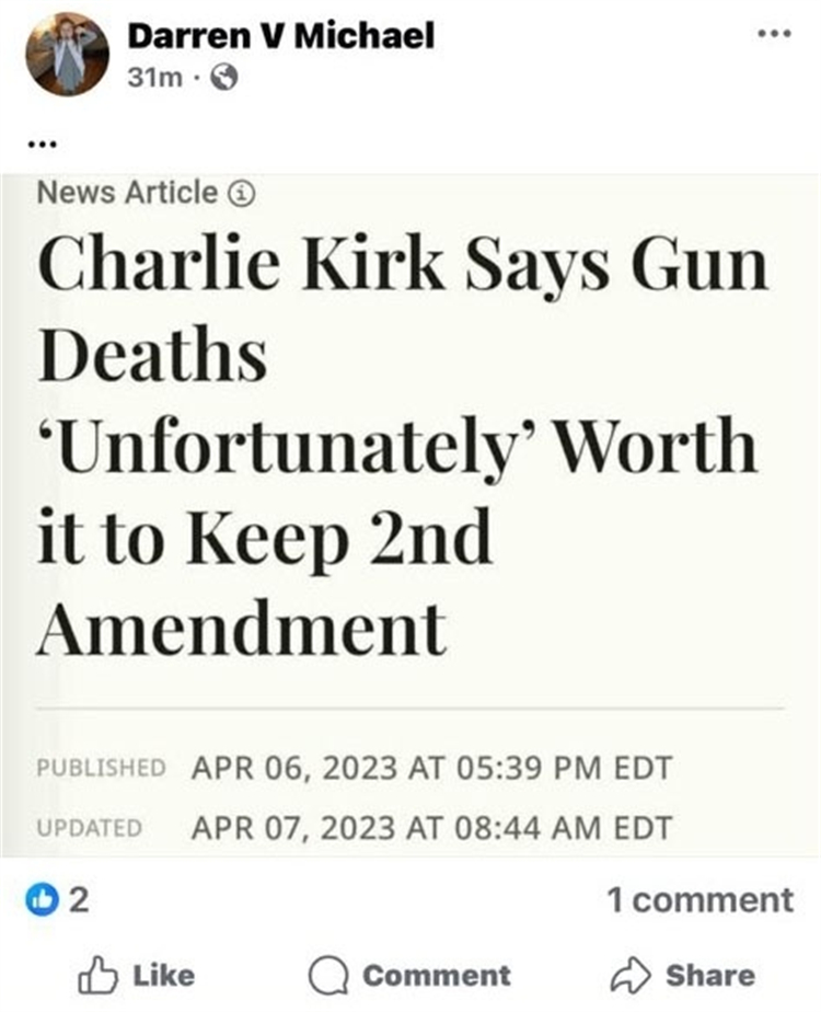 據路透社、福克斯新聞台等媒體報道,柯克遭槍殺以來,在美國至少有15人因在網上發表「不當」言論被解僱或停職,其中包括記者、學術工作者和教師等。