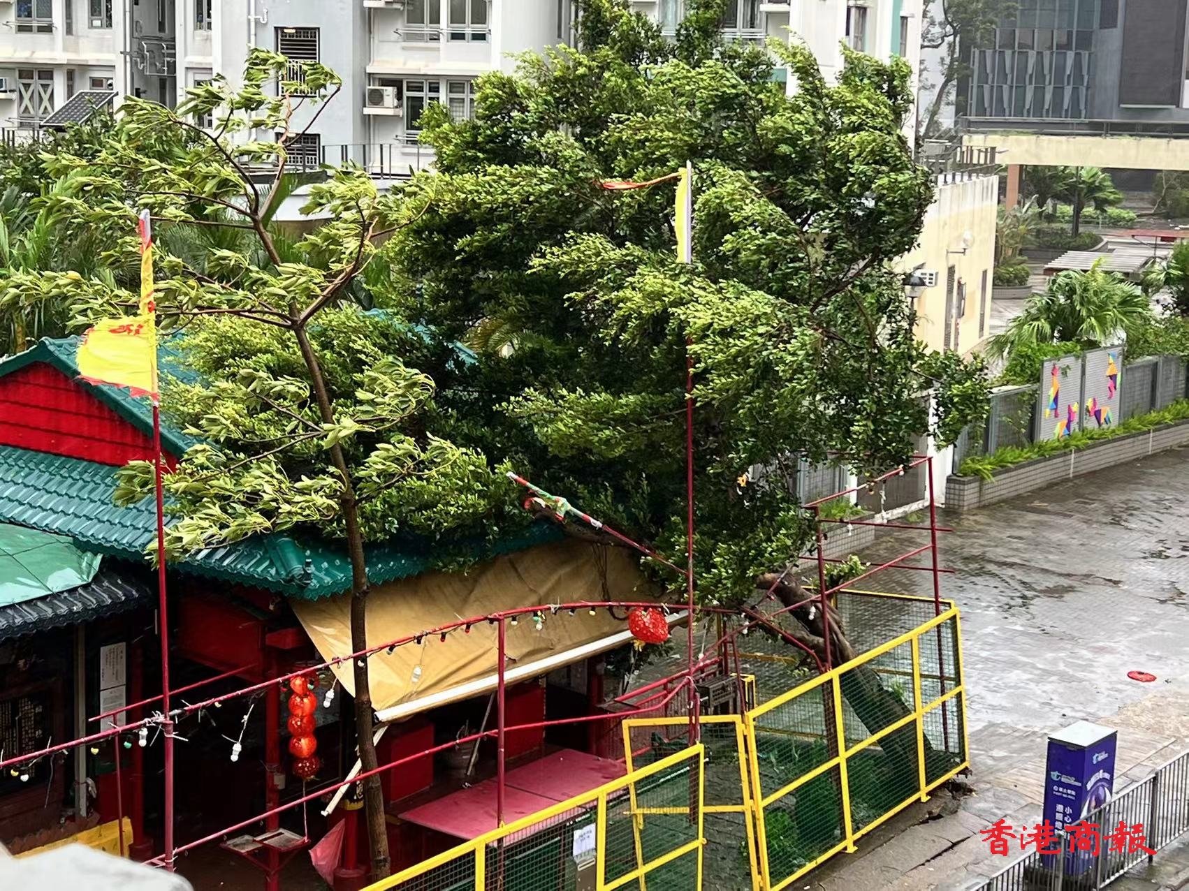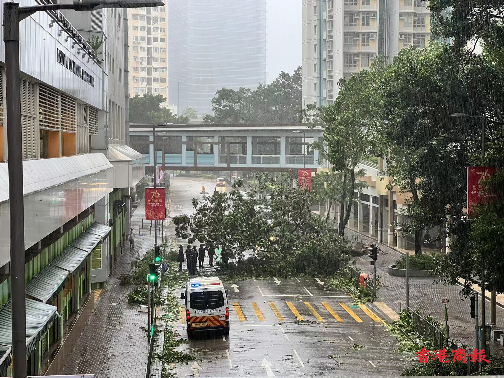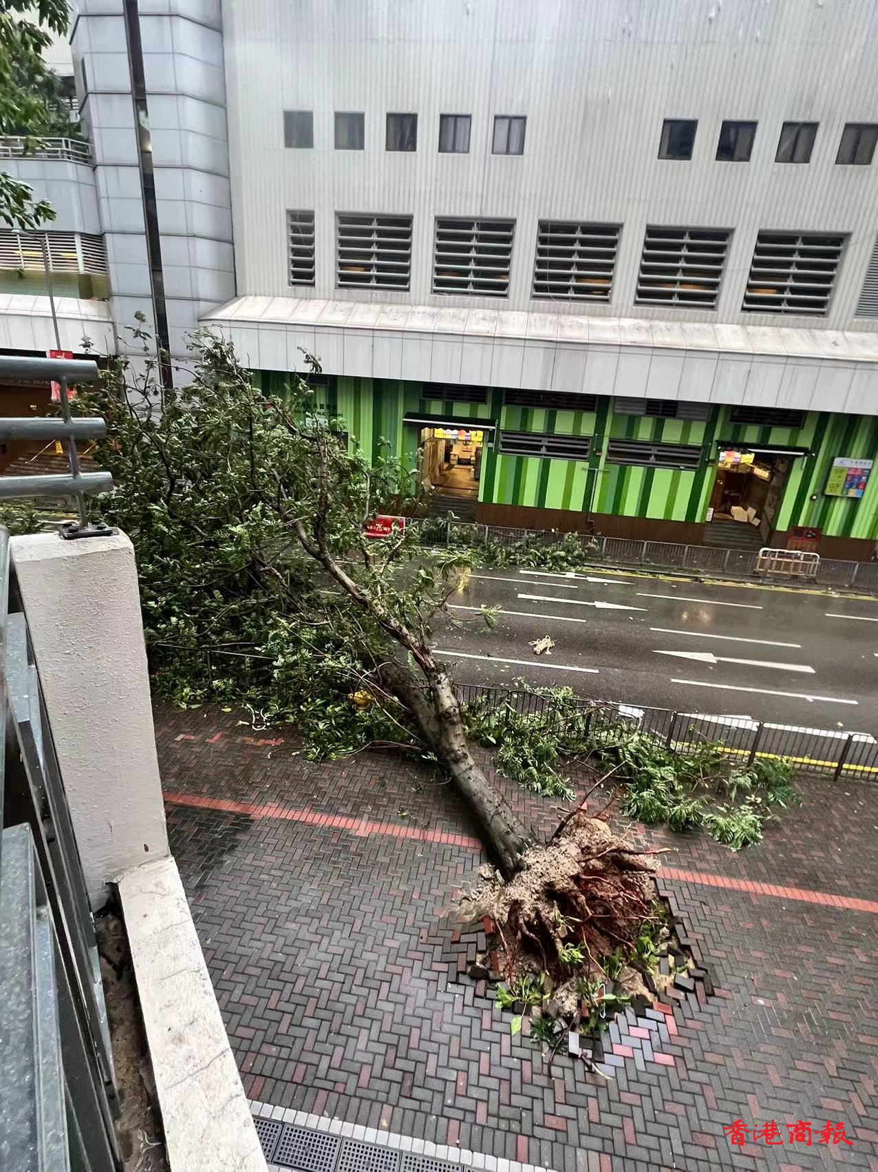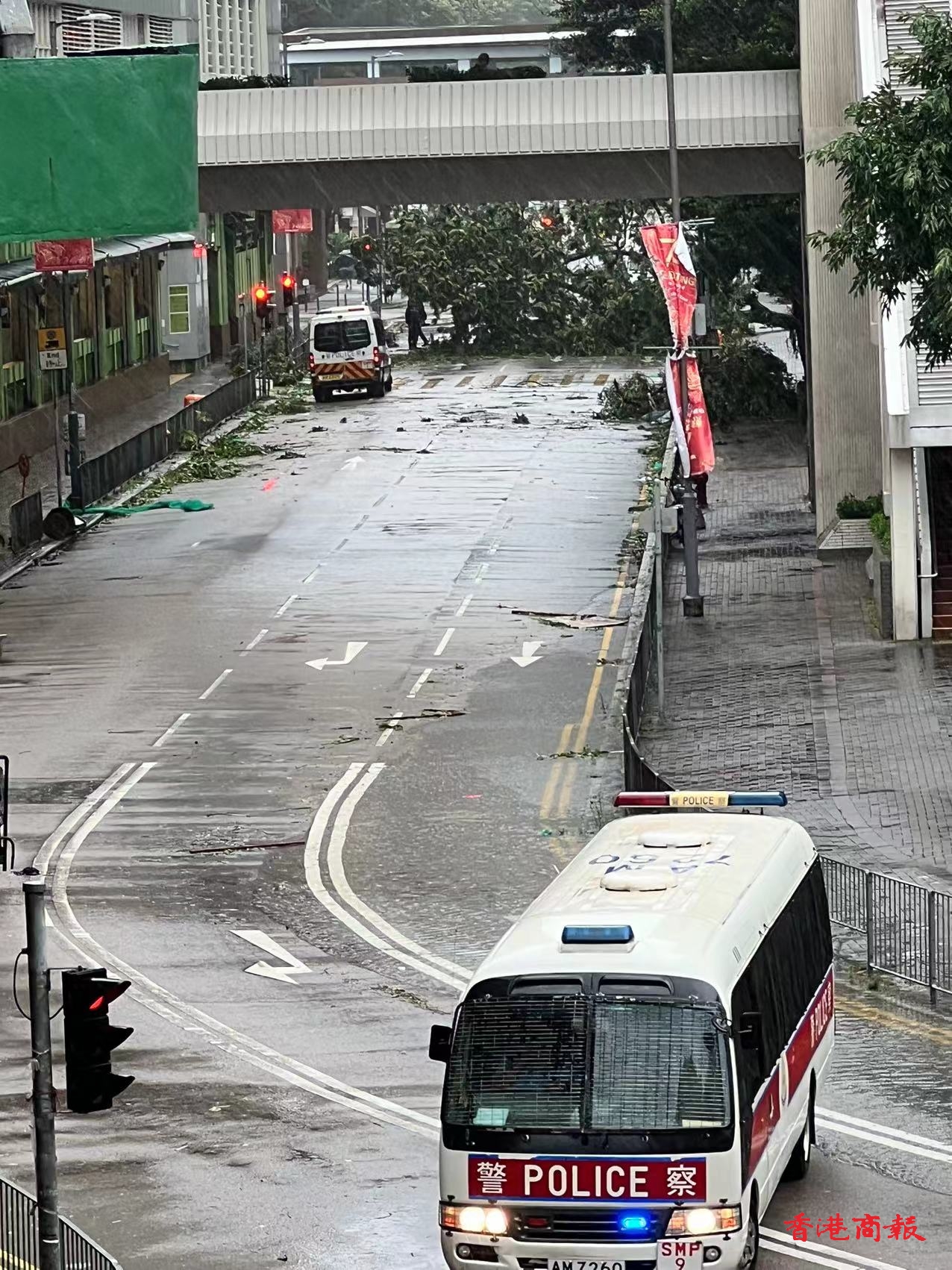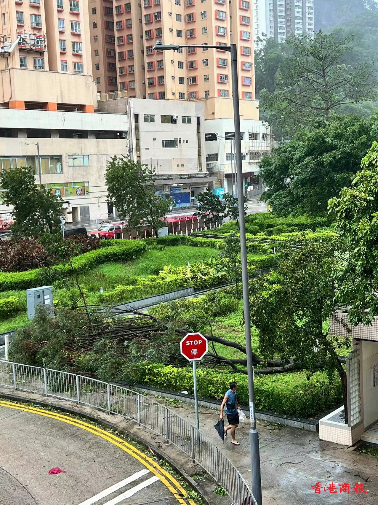 牛頭角道大樹倒塌折斷,警方封路,工人緊急清理。