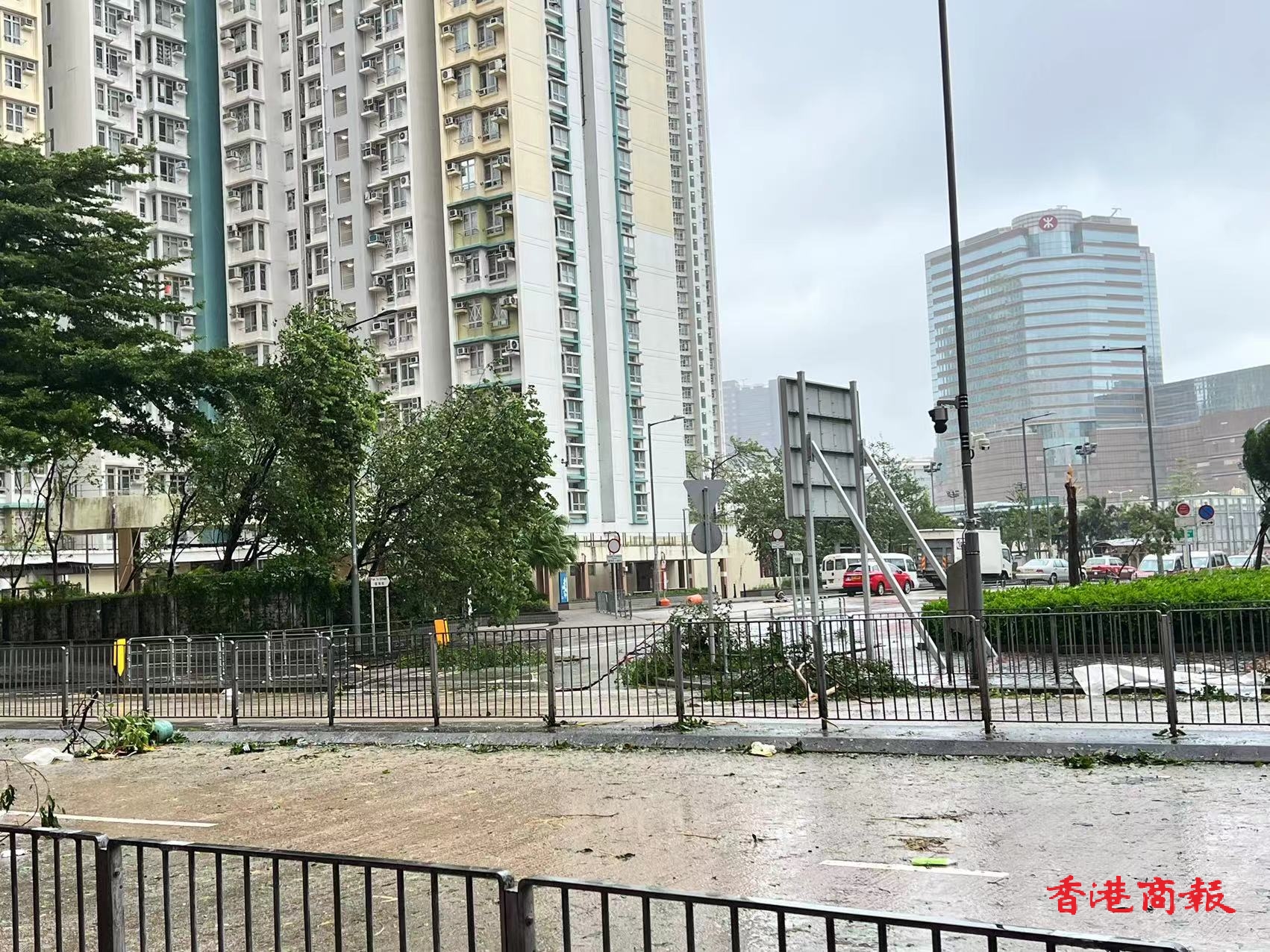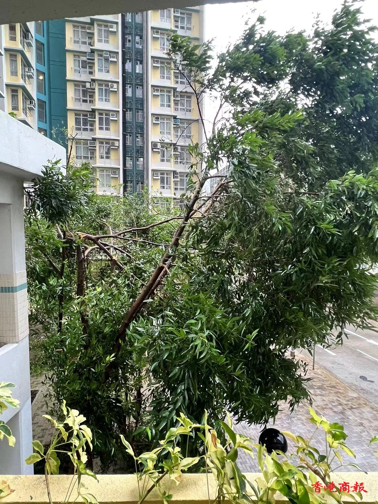 牛頭角樂華邨十號風球下到處都有被吹倒的樹枝,遍地樹葉。由屋苑去商場的通道因雜物淤塞形成水窪,市民需淌水通行。有屋苑管理員正在清理渠口。(馮瀚文 攝)