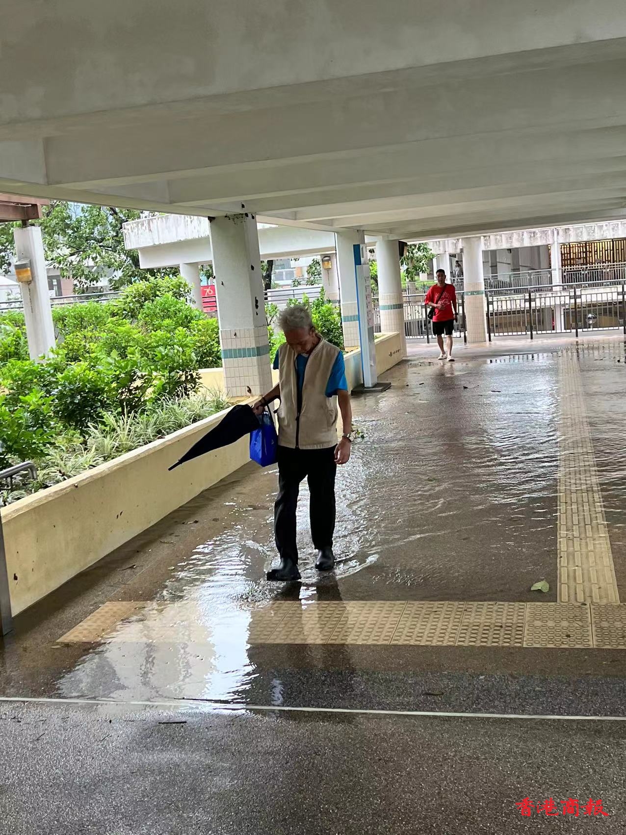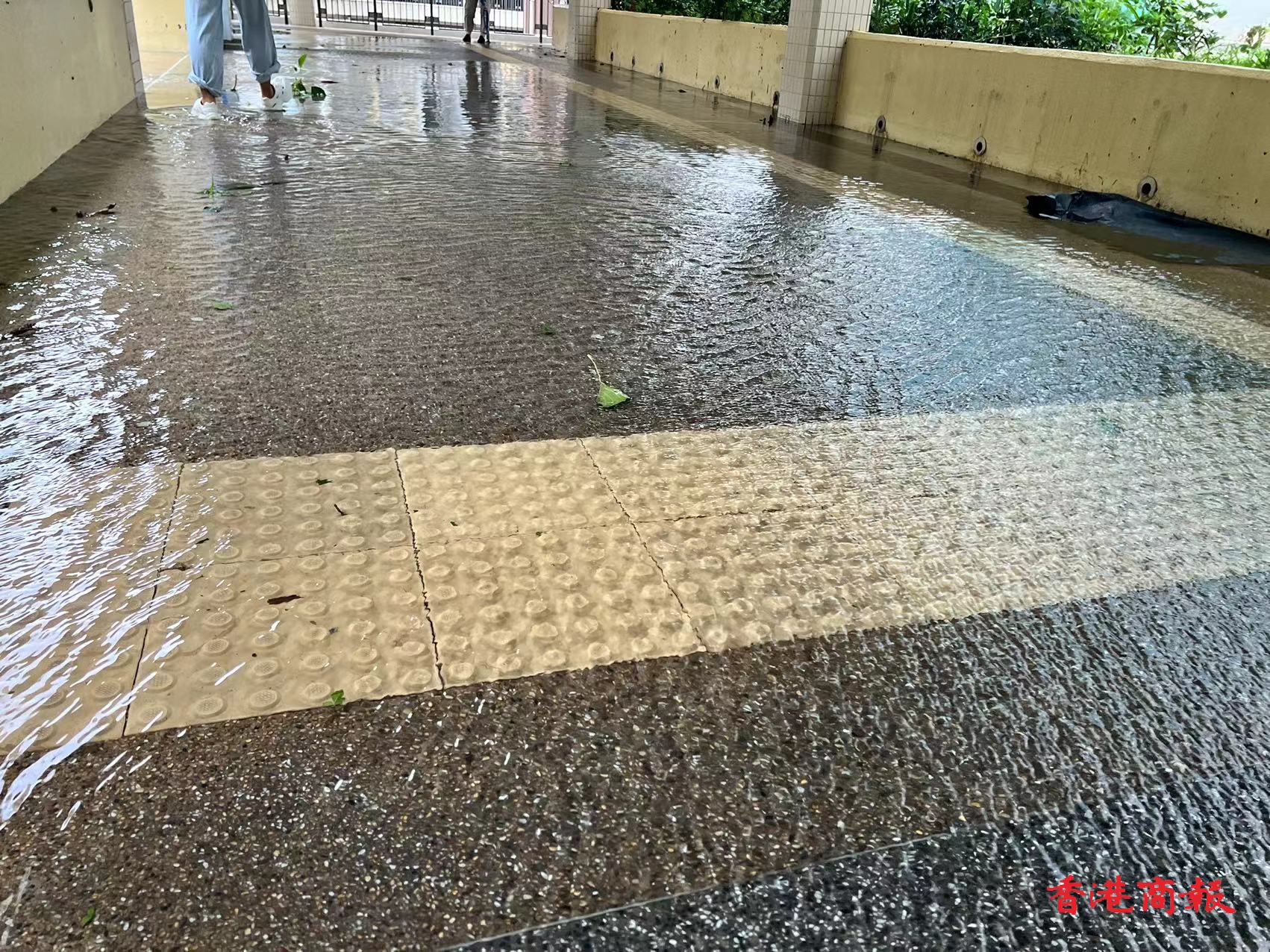 牛頭角街市通往九龍灣站的有蓋空中連廊積水,市民須趟水而過。