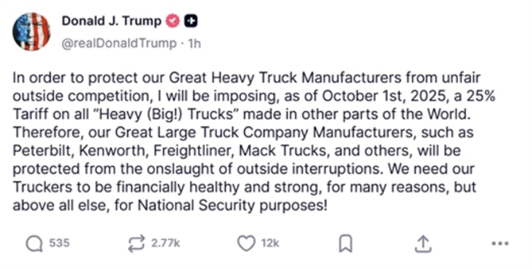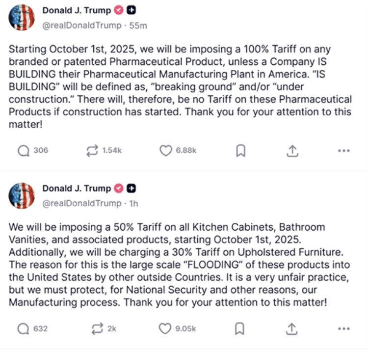 綜合央視新聞等媒體報道,當地時間9月25日,美國總統特朗普在其社交媒體「真實社交」宣布,自10月1日起,美國將對多類進口產品實施新一輪高額關稅。措施包括對所有進口重型卡車加徵25%關稅;對廚房櫥櫃、浴室洗手台及相關建材徵收50%關稅;對進口家具徵收30%關稅;並對專利及品牌藥品加徵100%關稅。