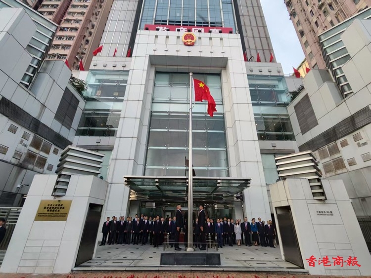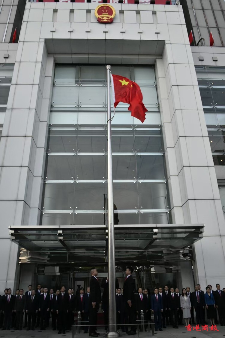 中聯辦主任周霽率領一眾副主任及幹部員工代表,於早上在辦公樓前莊嚴肅立。升旗手護送國旗進場,隨後升起國旗,全體人員向國旗行注目禮致敬,並奏唱國歌。