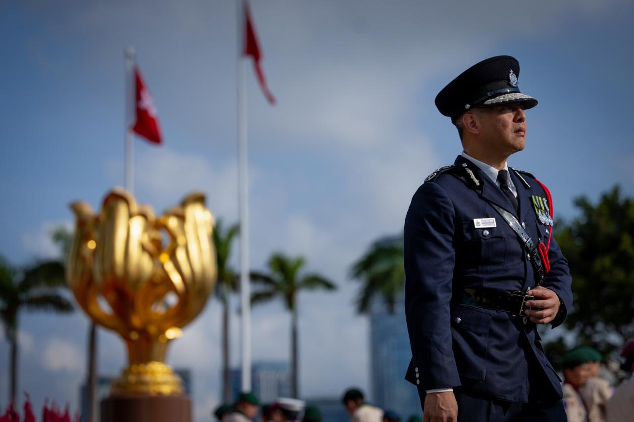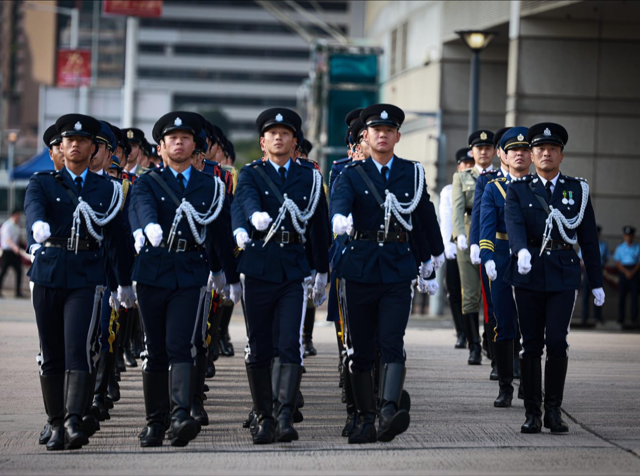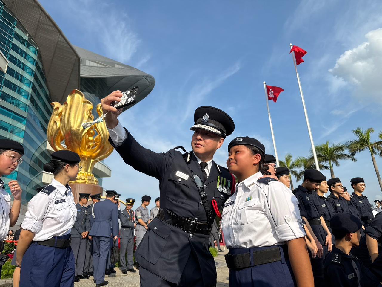 升旗儀式過後,護旗方隊步伐齊整離開會場。警務處處長周一鳴亦在場觀禮,並與少年制服團隊隊員合照留念。(記者 區天海)