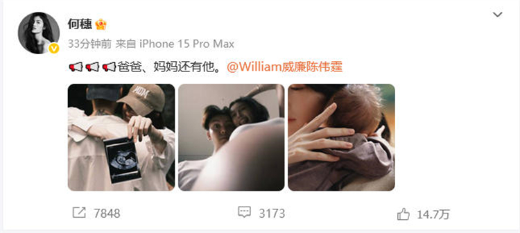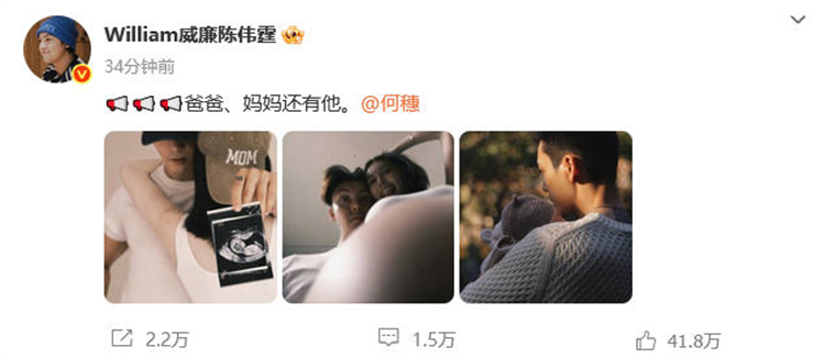 10月18日,陳偉霆和何穗在社交平台曬出互相呼應的B超照、孕期照、和兒子的合照並互@,官宣得子,配文:「📢📢📢爸爸、媽媽還有他。」