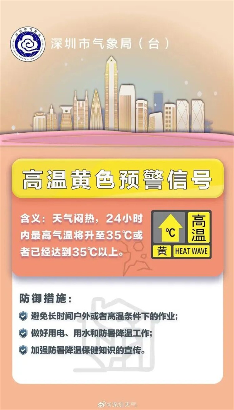 深圳市氣象台2025年10月18日08時30分發布全市陸地高溫黃色預警信號,預計18日深圳市大部分地區最高氣溫將升至35℃或以上,信號可能持續1天。