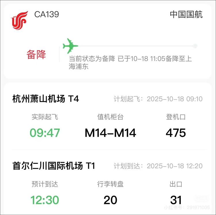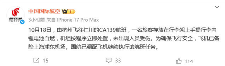 10月18日,由杭州飛往仁川的CA139航班,一名旅客存放在行李架上手提行李內鋰電池自燃,機組按程序立即處置,未出現人員受傷。為確保飛行安全,飛機已備降上海浦東機場。國航已調配飛機繼續執行該航班任務。(圖源 橙柿互動)