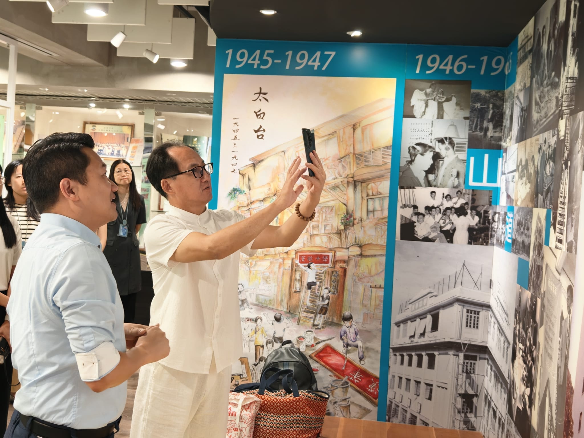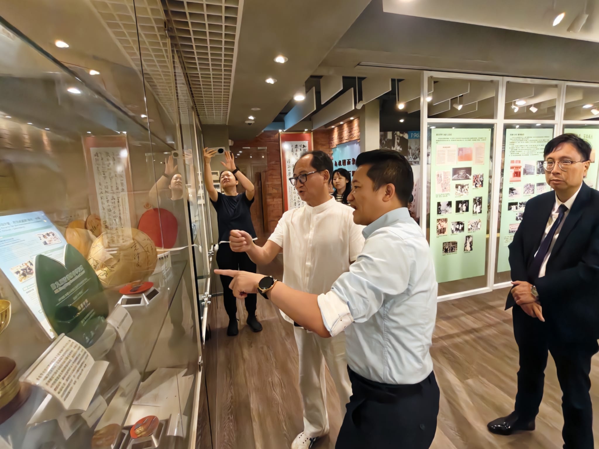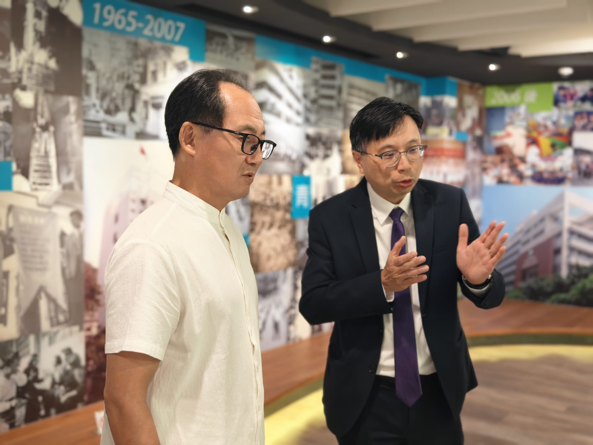 漢華中學創立於1945 年12月,是首間在香港創辦的傳統愛國學校,今年迎來80周年慶典。分享會開始前,校長關頴斌與多名老師陪同衣向東參觀了該校的校史室。