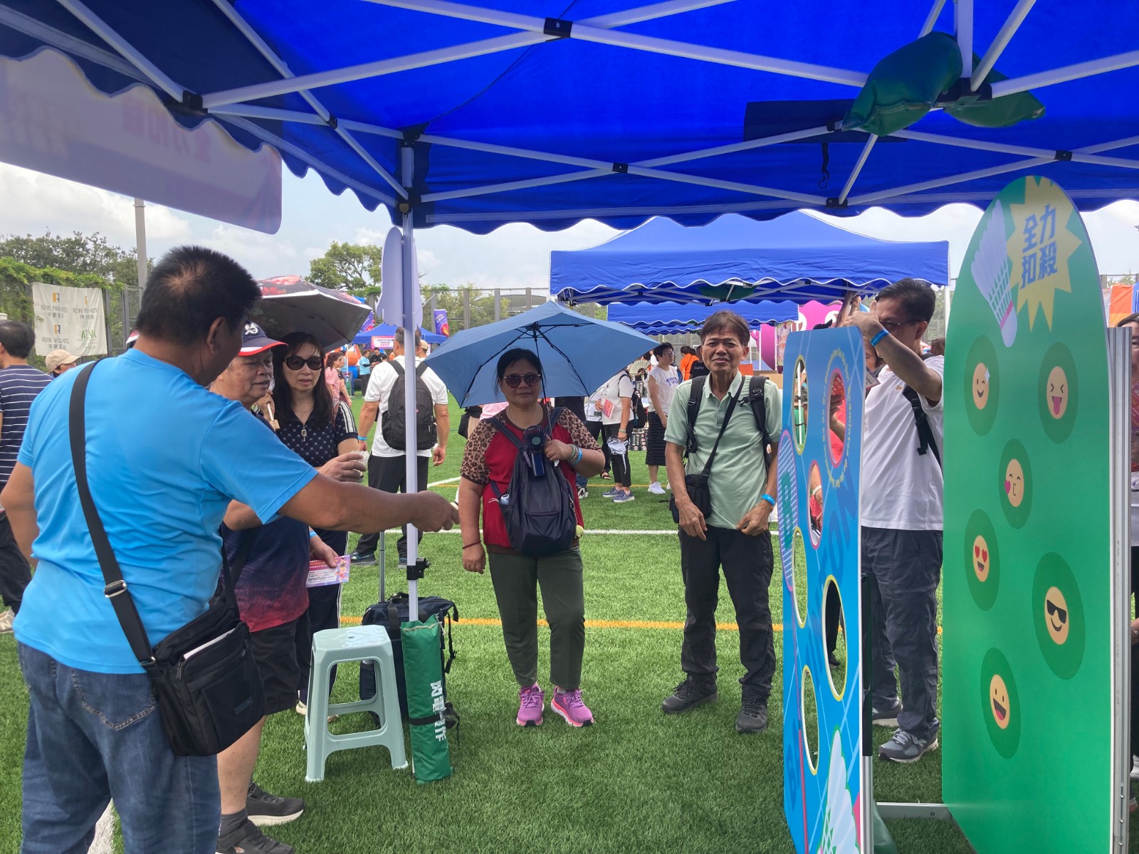 謝先生帶同屬會十來個會員來參加嘉年華活動。他說自己從屯門過來,有點遠。他剛剛玩打羽毛球遊戲,玩得很開心。