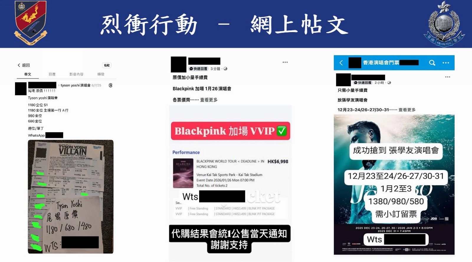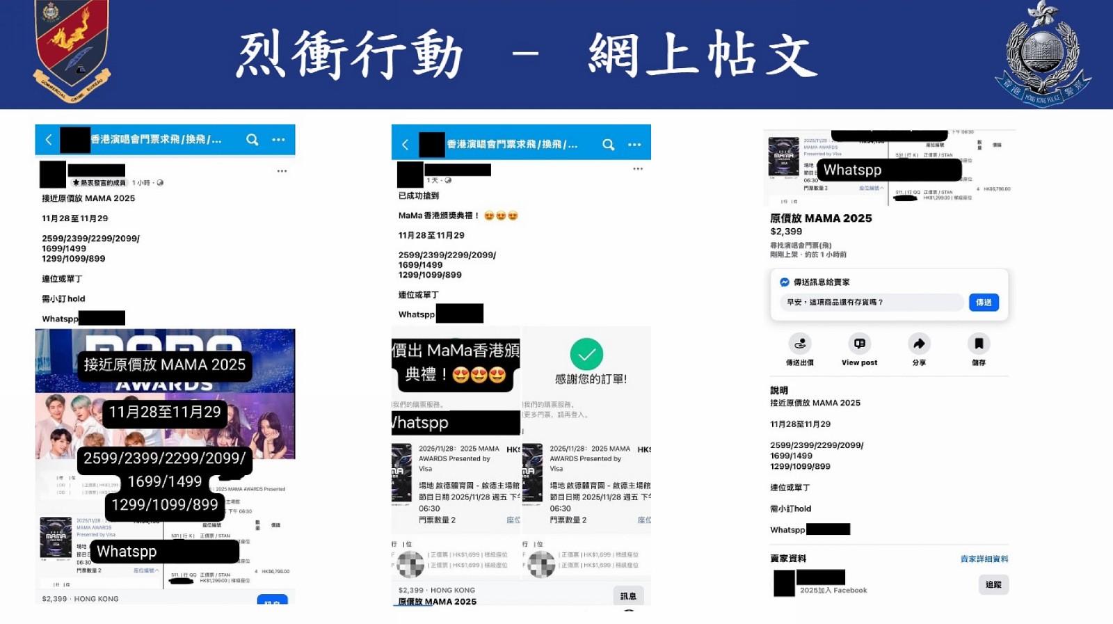 警方商業罪案調查科展開代號「烈衝」行動,搗破一個本地網上購票詐騙集團,相信活躍數月在網上出售黃牛飛或假門票,涉及多個大型演唱會和體育賽事,包括MAMA音樂頒獎禮、Tyson yoshi和張學友演唱會;昨日(20日)拘捕5名男女,涉及約200名受害人,損失金額約50萬元。