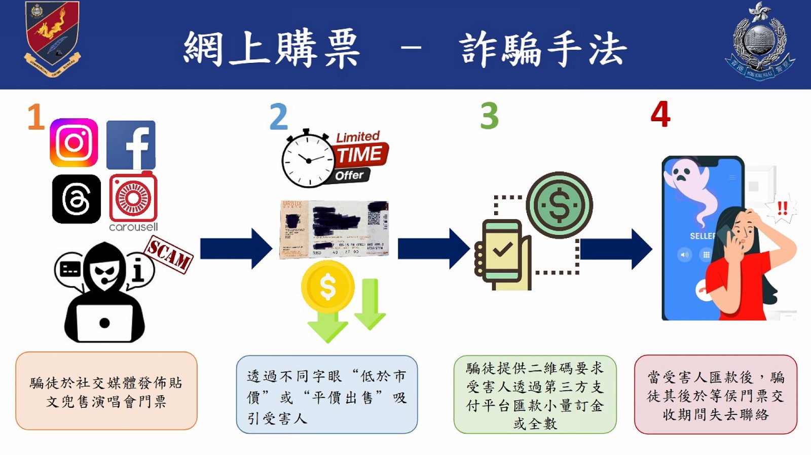有見及此,商業罪案調查科連月來進行情報搜集和資料分析,鎖定一個本地犯罪團夥,會透過不同社交平台訛稱以原價或稍高價錢代購或售賣不同演唱會或球賽門票,誘使市民下訂金或支付門票全數金額到騙徒提供的儲值支付工具賬戶以確保票源。受害人往往因見涉及金額比門票價錢相對較少而掉以輕心,騙徒亦會在受害人將金錢存入後失去聯絡。