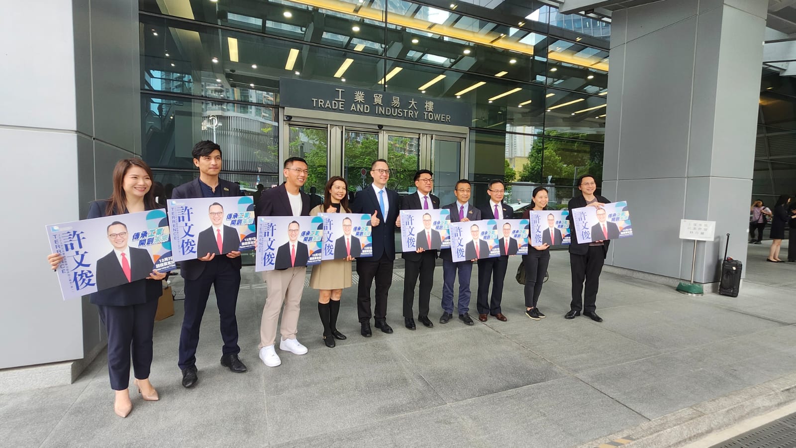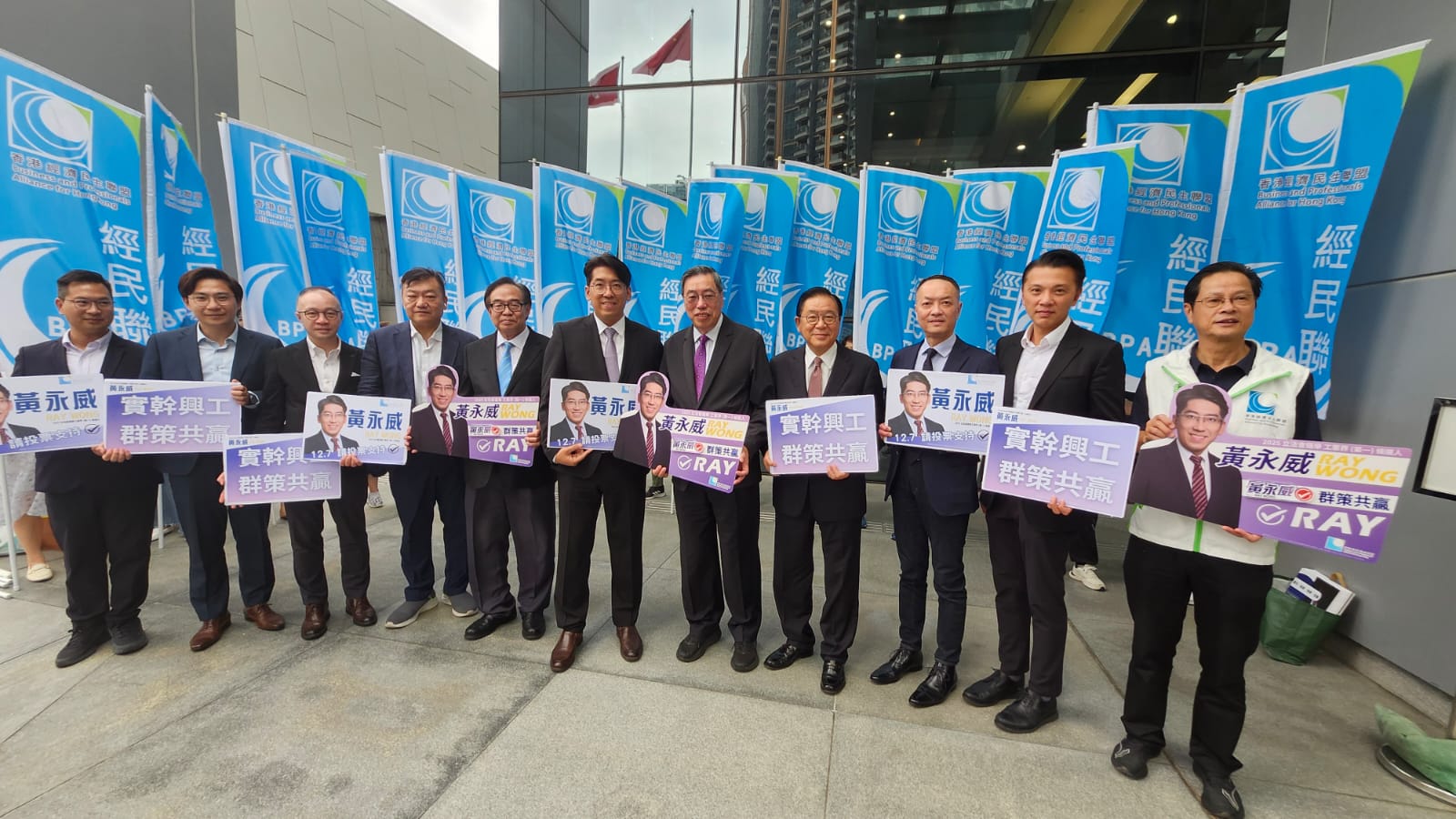 黃永威及許文俊在報名前,在經民聯監事會主席林建岳、經民聯榮譽主席梁君彥、經民聯主席盧偉國、經民聯副主席林健鋒、經民聯副主席吳永嘉、經民聯監事會副主席胡劍江及香港工業總會主席林世豪陪同下出席造勢活動。
