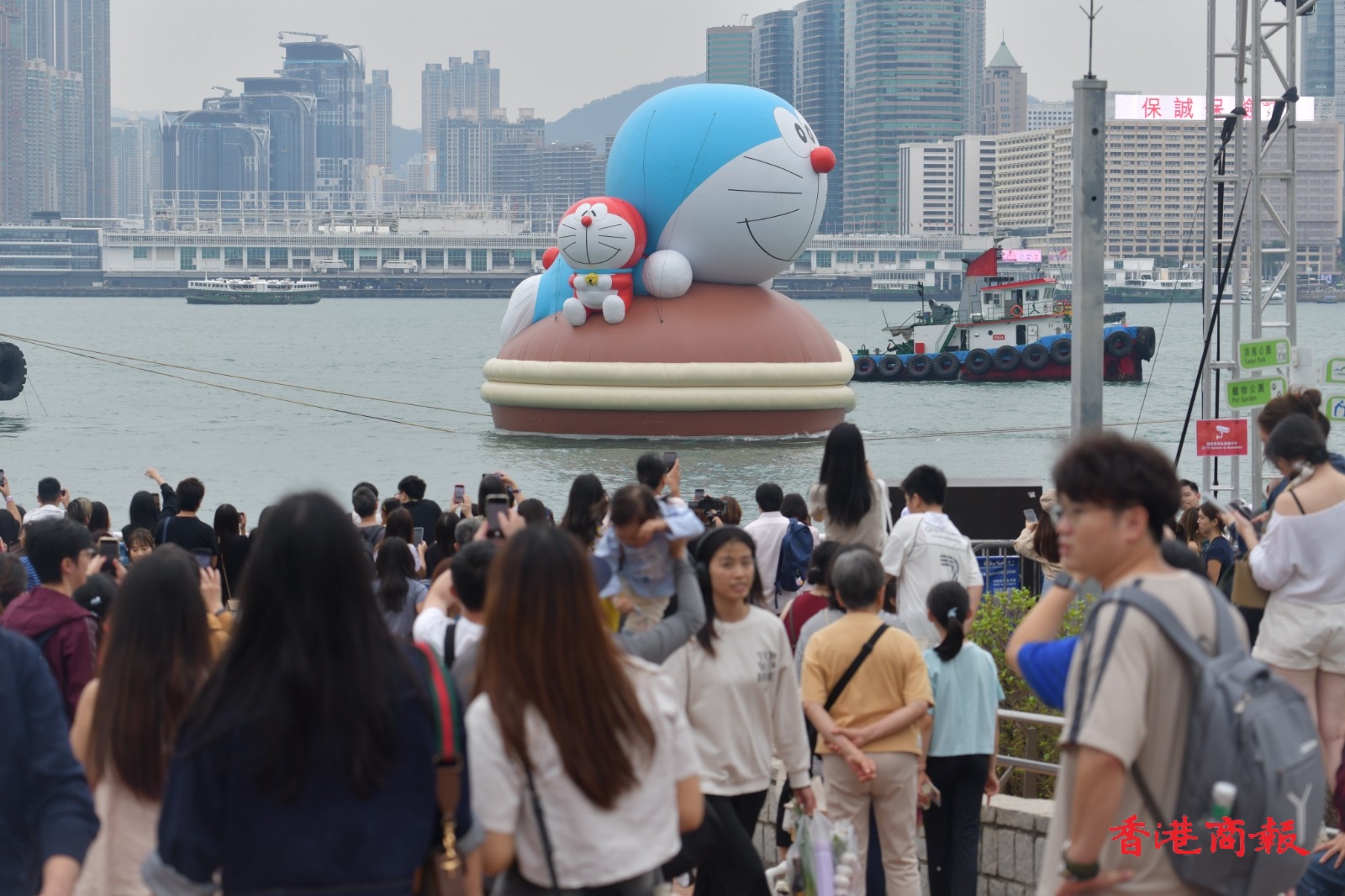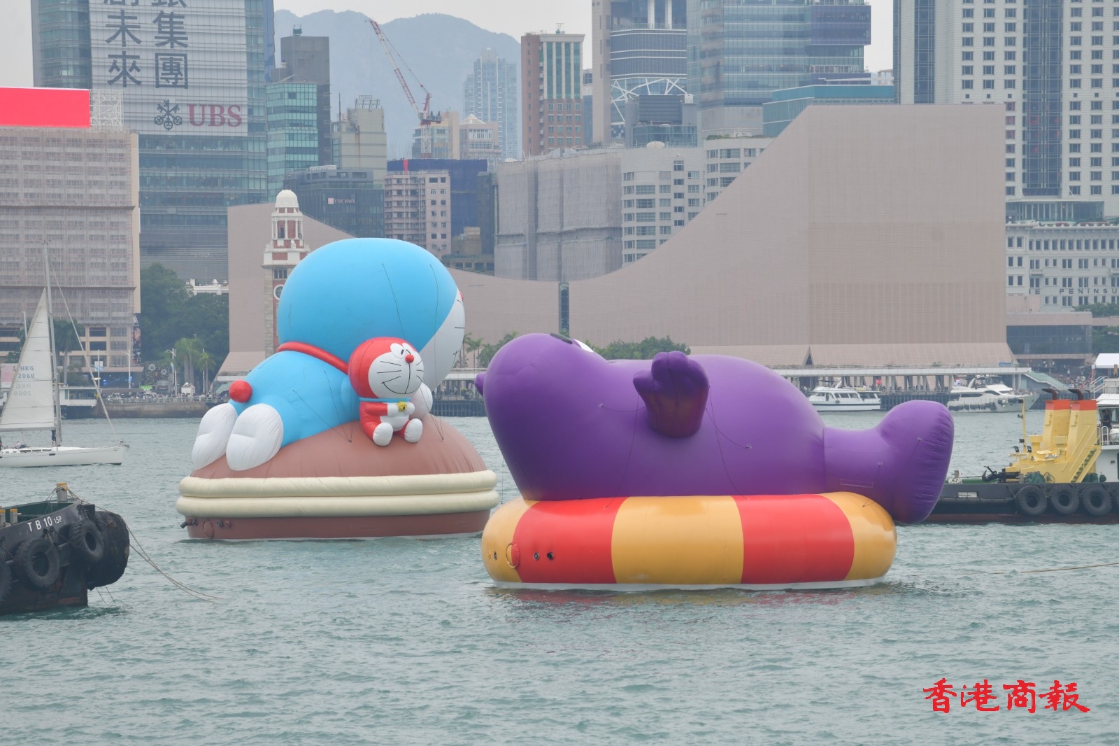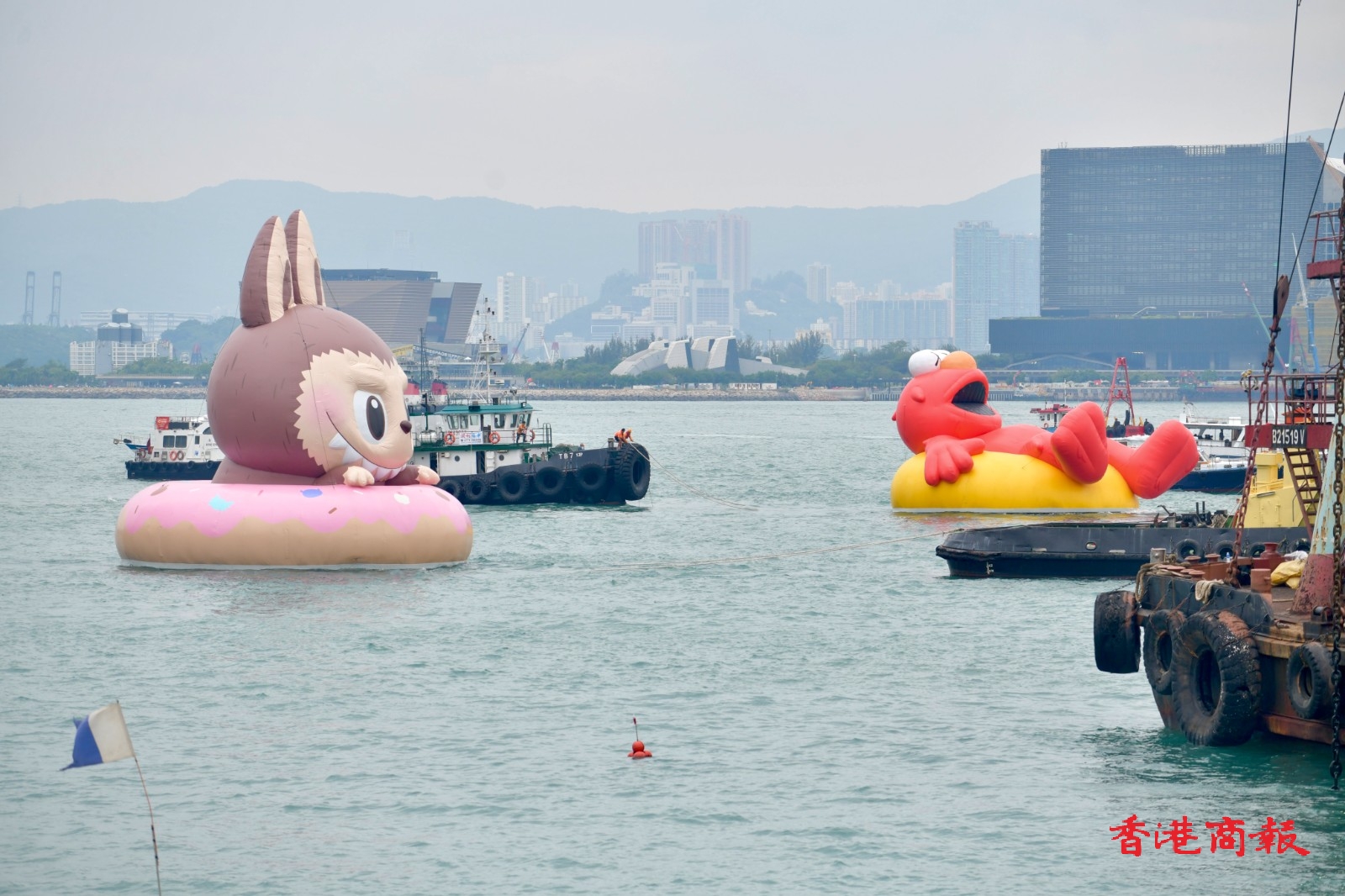 多啦A夢、KAWS & 芝麻街(Elmo)、滑嘟嘟及LABUBU四座巨型海上充氣雕塑展示8日以來,已吸引成千上萬市民旅客前來駐足觀賞打卡,今日更組成「夢幻艦隊」,於下午2時啟航,依次駛離金鐘添馬公園對開海域,巡遊維港兩岸兩圈,歷時逾3小時,為香港獻上一場前所未見的海上藝術盛典。