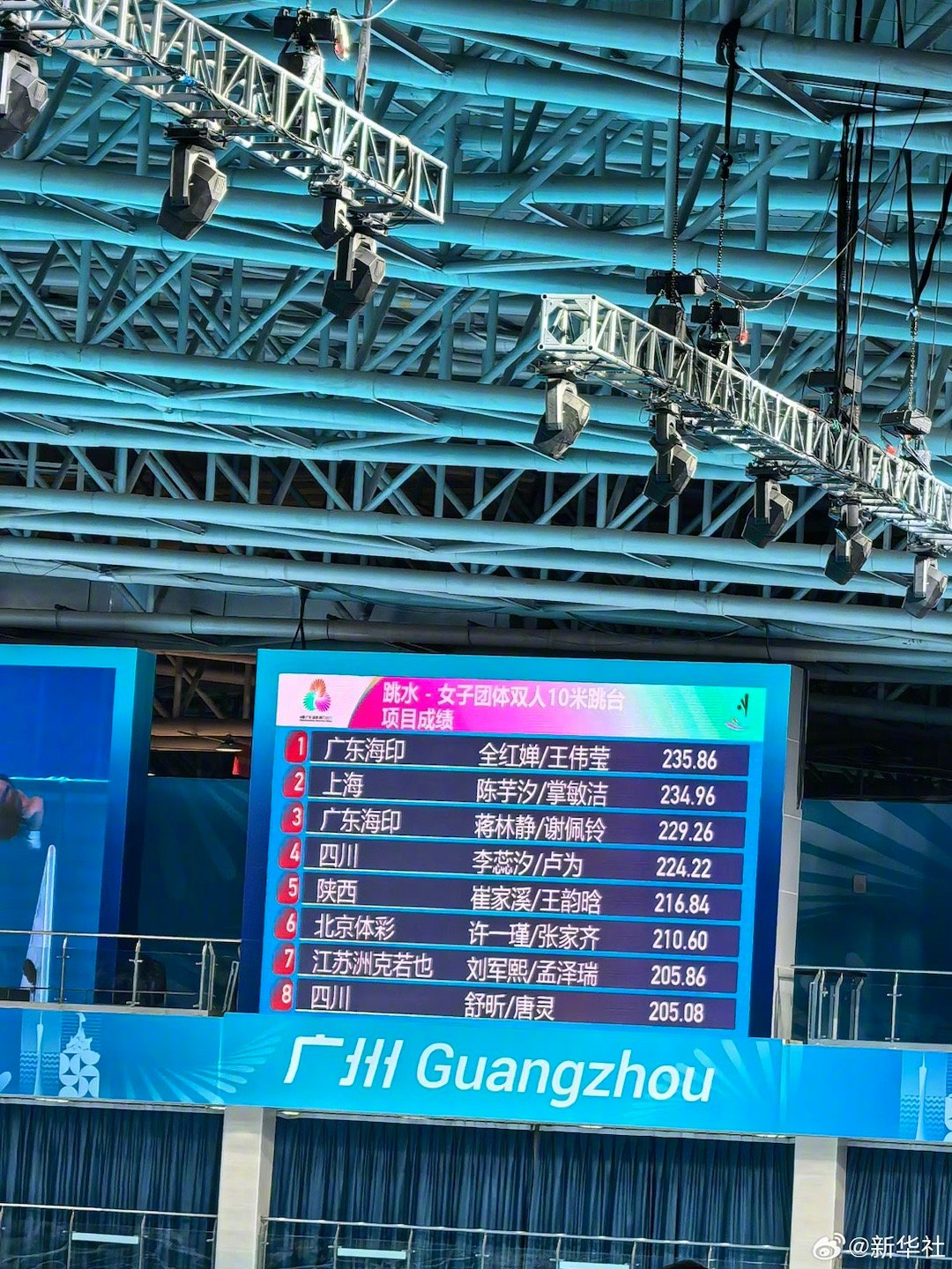 11月2日晚,第15屆全運會跳水項目比賽在廣州拉開帷幕奧運冠軍、廣東選手全紅嬋搭檔王偉瑩出戰女團雙人10米台,3跳穩定發揮,以235.86的總成績排名第一,成功衛冕!這也是全紅嬋傷愈復出後的賽場首秀。