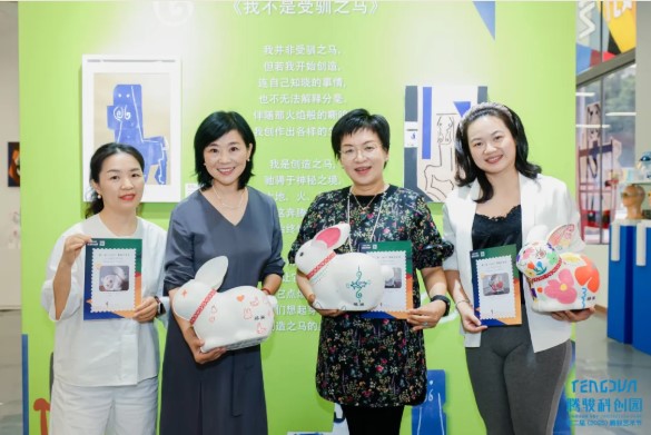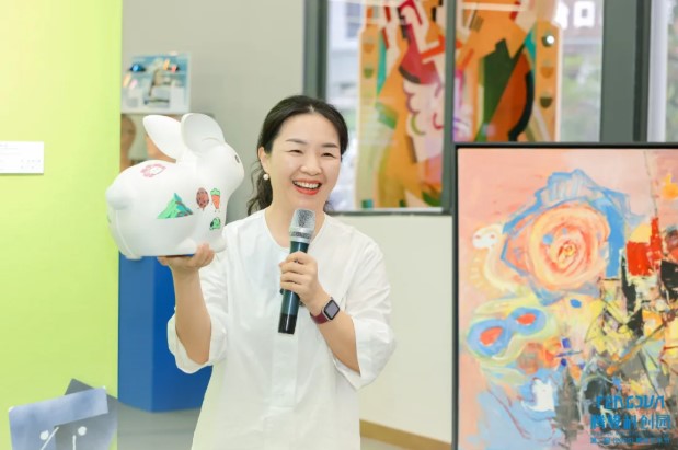 活動伊始,「中秋兔兔手繪作品展評」 環節便點燃了現場氛圍。這些參展作品的「載體」特別,並非專業畫紙,而是一款中秋月餅的白色紙殼包裝盒,形似一隻靈動的兔子。在活動發起之初,騰駿藝術節便希望以「環保+創意」的形式,讓傳統節日與藝術創作碰撞出火花,邀請大家發揮想象,用畫筆為素白的兔形包裝盒賦予生命力。經過前期徵集,9件風格迥異的優秀作品脫穎而出,站上本次展評的舞台。最小年齡的創作者金泊志小朋友也通過VCR向大家講述自己的創作心得,他筆下的《GIOGIO》滿是童趣,瞬間暖化全場。