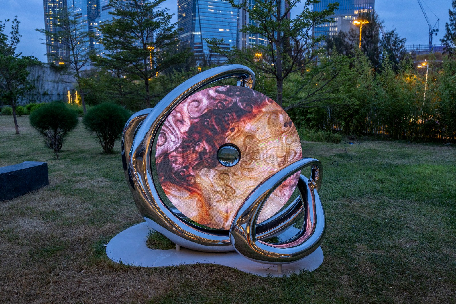 圖片說明:錄像雕塑裝置《地脈憶記》以現代首飾流線型不鏽鋼盤旋環繞,象徵延綿不斷的時間,邀請觀眾從過去步向未來。(圖片來源:香港故宮文化博物館)